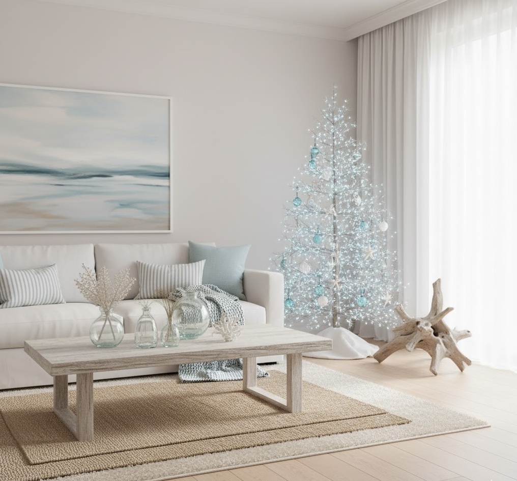 Coastal Modern Christmas Vibes brings the serene beauty of the seaside indoors, offering a refreshing and airy take on festive decorating. This style combines nautical elements with contemporary simplicity, creating a tranquil and light-filled atmosphere. Materials often include driftwood, natural linen, glass, and subtle rope accents, evoking a sense of calm and connection to the ocean. The colour palette is dominated by cool blues, crisp whites, sandy beiges, and soft greens, mirroring the hues of the beach and sea. Decorations are typically understated and organic, such as shell ornaments, glass floats, and delicate fairy lights reminiscent of distant stars. Functionality is about creating an open and uncluttered space that feels breathable and relaxing. The mood is peaceful, refreshing, and effortlessly chic, making this modern Christmas decor perfect for those seeking a calm and sophisticated holiday escape.