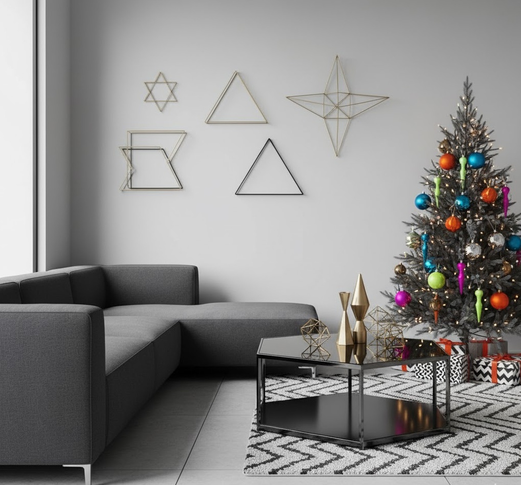 Geometric Modern Festive Decor celebrates bold shapes, clean lines, and abstract patterns, bringing a contemporary and dynamic energy to holiday styling. This modern Christmas decor approach is all about visual impact and a sense of architectural precision. Materials often include polished metals like brass or chrome, glass, acrylic, and sleek ceramics, creating sharp, defined forms. The colour palette can be either vibrant and contrasting, featuring primary colours or jewel tones, or more subdued with metallics and neutrals, depending on the desired mood. Decorations are typically angular, abstract, or feature repeating patterns, such as faceted baubles, wireframe stars, and tessellated garlands. Functionality is about creating a visually stimulating space that feels organised and intentional. The mood is energetic, sophisticated, and distinctly avant-garde, offering a cutting-edge interpretation of festive cheer that appeals to modern design enthusiasts.