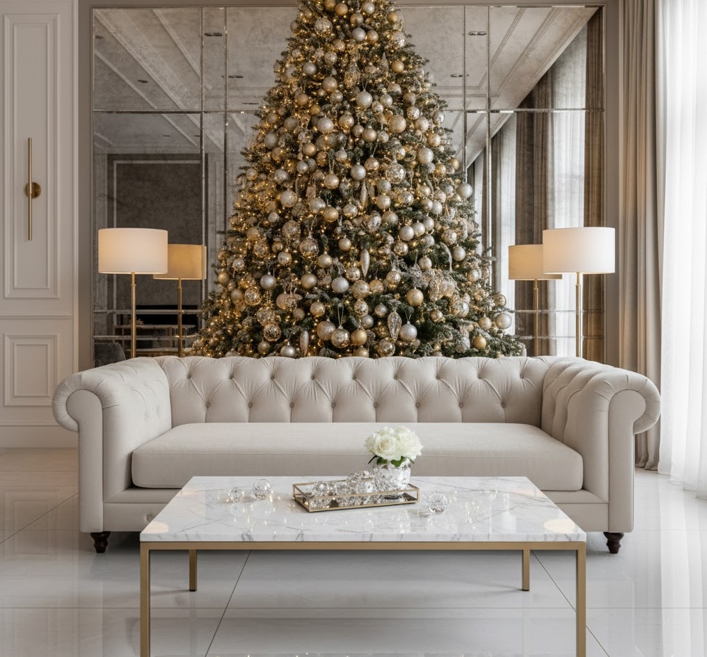 Glamorous Modern Christmas Decor exudes luxury and sophistication, transforming spaces into opulent festive havens. This style is characterised by rich textures, reflective surfaces, and a lavish use of metallics. Materials often include plush velvets, polished marble, mirrored finishes, and sparkling crystal, all contributing to an air of extravagance. The colour palette is bold and decadent, featuring deep jewel tones like emerald green, sapphire blue, and ruby red, often paired with shimmering gold, silver, or rose gold accents. Decorations are typically ornate and eye-catching, such as oversized baubles, crystal garlands, and statement centrepieces. Functionality is about creating an immersive, luxurious experience, where every detail contributes to a sense of grandeur. The mood is one of dazzling elegance and festive indulgence, making this modern Christmas decor perfect for those who desire a truly spectacular holiday display.