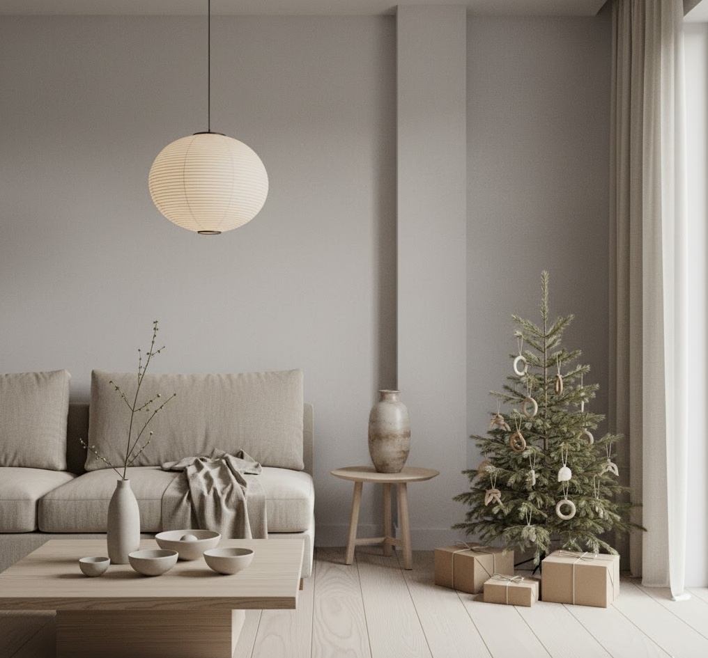 Japandi Modern Christmas Serenity merges the minimalist elegance of Japanese aesthetics with the cosy warmth of Scandinavian design, creating a tranquil and harmonious festive space. This modern Christmas decor approach is about balance, natural beauty, and understated sophistication. Materials are predominantly natural – light wood, ceramics, linen, and paper – all chosen for their tactile qualities and organic appeal. The colour palette is muted and calming, featuring warm greys, soft whites, natural beiges, and subtle hints of deep green or indigo, creating a serene backdrop. Decorations are sparse and intentional, often handmade or featuring simple, organic shapes, such as ceramic bowls with pine branches, paper lanterns, and delicate wooden ornaments. Functionality is about creating a peaceful and uncluttered environment that promotes mindfulness. The mood is calm, balanced, and deeply serene, offering a truly harmonious and sophisticated holiday experience.