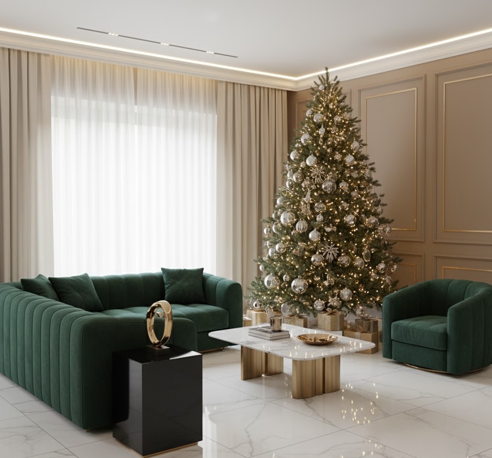Luxe Modern Christmas Opulence elevates festive decor to the highest level of sophistication and grandeur, focusing on bespoke details and exquisite craftsmanship. This modern Christmas decor style is about creating an atmosphere of unparalleled luxury and refined indulgence. Materials are premium and tactile – think polished marble, rich velvet, high-gloss lacquers, and bespoke metals – all contributing to an air of exclusivity. The colour palette is deep and sumptuous, featuring jewel tones like amethyst, sapphire, and ruby, often paired with shimmering gold, platinum, or deep charcoal for a dramatic effect. Decorations are often custom-made, oversized, or feature intricate detailing, such as hand-blown glass baubles, crystal chandeliers, and elaborate floral arrangements. Functionality is about creating an immersive, high-end experience that delights the senses. The mood is one of ultimate elegance and lavish celebration, making this modern Christmas decor perfect for a truly magnificent holiday.