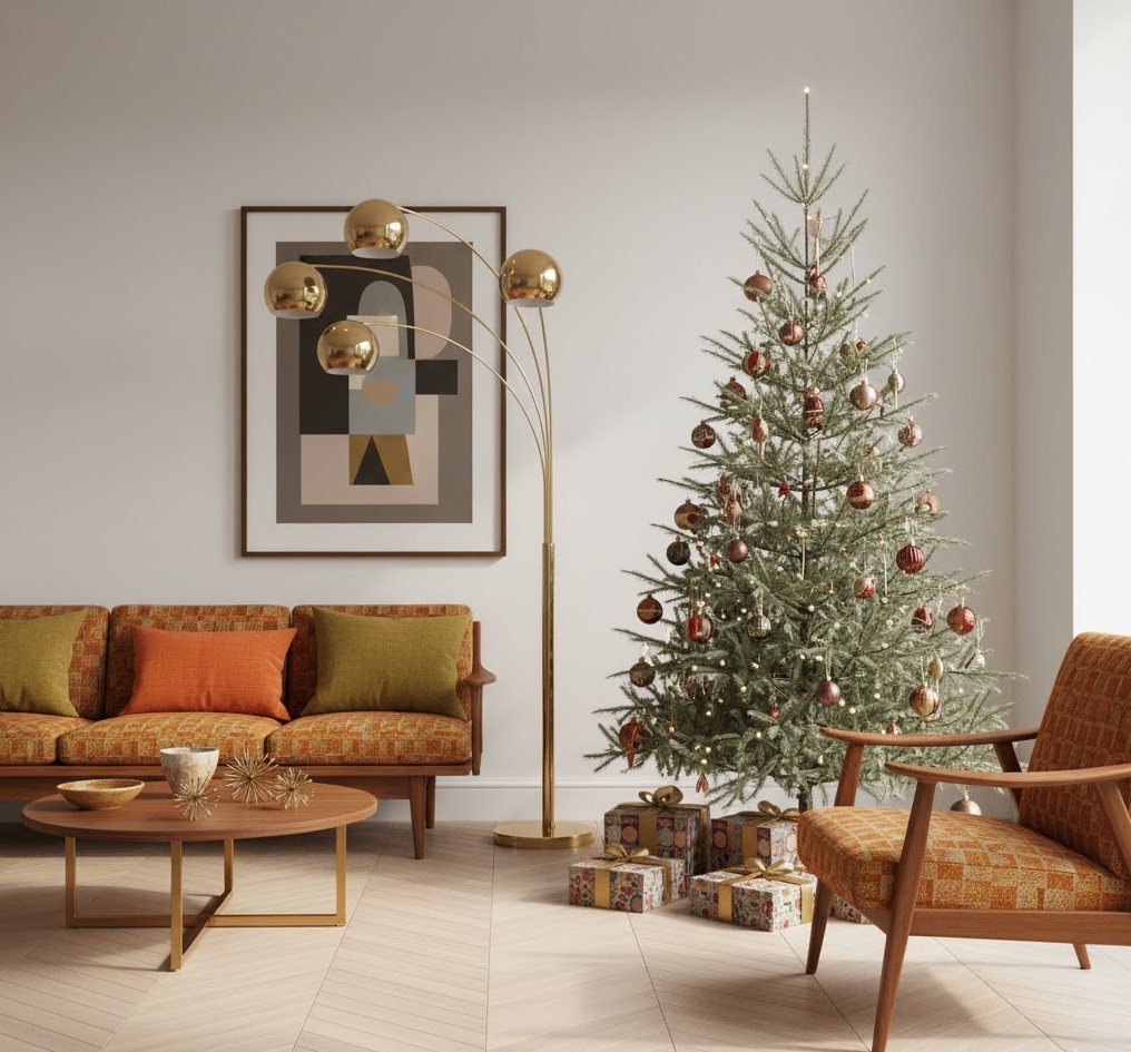 Mid-Century Modern Christmas Joy infuses festive decor with the iconic style of the 1950s and 60s, characterised by clean lines, organic shapes, and a playful use of colour. This modern Christmas decor approach celebrates timeless design and a sense of optimistic nostalgia. Key materials include teak wood, walnut, brass, and textured fabrics, all contributing to a sophisticated yet inviting aesthetic. The colour palette is often a vibrant mix of olive green, mustard yellow, burnt orange, and teal, balanced with neutral tones for a retro-chic feel. Decorations are typically geometric, Sputnik-inspired, or feature atomic patterns, such as starburst ornaments and sleek, minimalist baubles. Functionality is about combining form and function, with decor that is both stylish and practical. The mood is cheerful, sophisticated, and distinctly retro, offering a unique and joyful interpretation of holiday cheer.