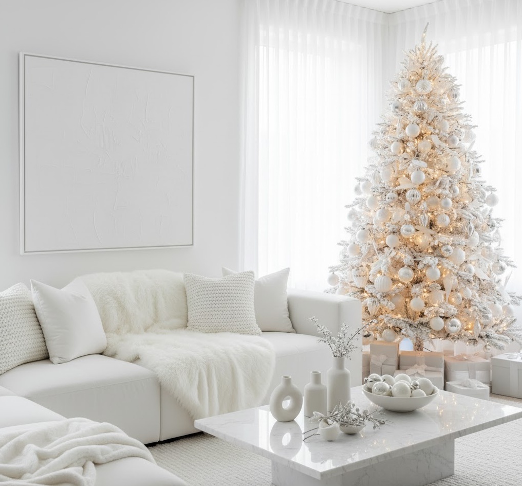 Monochromatic Modern Christmas focuses on the elegant power of a single colour, explored through varying shades, tones, and textures, creating a sophisticated and cohesive festive look. This modern Christmas decor approach is about subtlety and depth, proving that a limited palette can be incredibly impactful. Materials are chosen for their textural qualities – think matte ceramics, glossy metals, plush velvets, and sheer fabrics – all within the chosen colour family. The colour palette is, by definition, singular, such as all white, all grey, all black, or perhaps a deep navy, with variations in lightness and saturation. Decorations are simple yet striking, relying on form and texture to create visual interest rather than contrasting hues. Functionality is about creating a harmonious and calming environment. The mood is refined, chic, and effortlessly stylish, offering a truly contemporary and artistic take on holiday decorating.