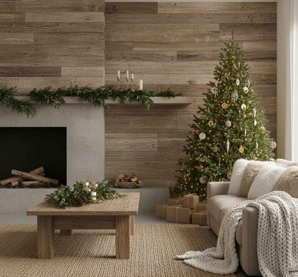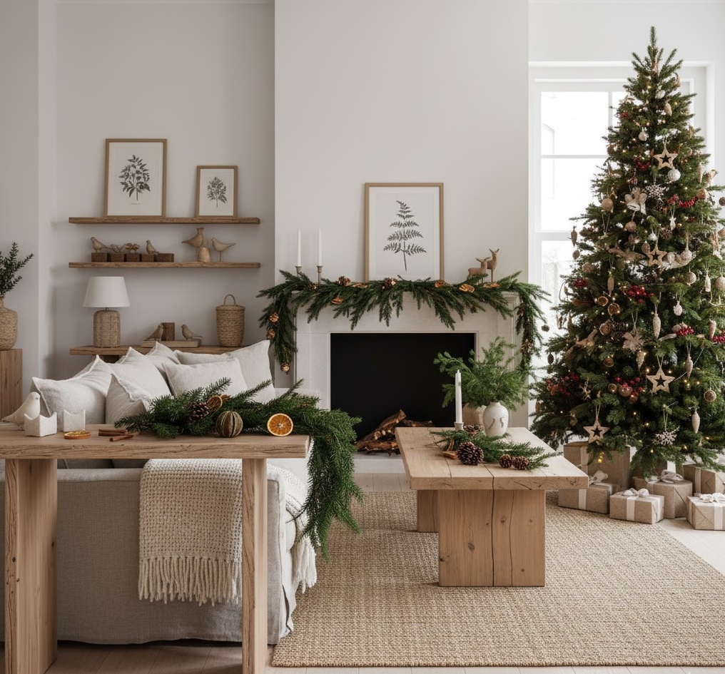 Nature Inspired Modern Christmas brings the beauty of the outdoors inside, celebrating organic forms and natural elements with a contemporary twist. This modern Christmas decor approach creates a serene and earthy festive atmosphere, connecting residents with the natural world. Materials are predominantly organic – think real pine branches, dried oranges, pinecones, moss, linen, and untreated wood – all chosen for their raw beauty and tactile appeal. The colour palette is grounded in natural greens, earthy browns, warm creams, and subtle pops of berry red or deep rust, mirroring the hues of a winter forest. Decorations are often foraged or handcrafted, such as garlands of dried leaves, wooden animal figures, and simple ceramic pieces. Functionality is about creating a calming and harmonious space that feels authentic and sustainable. The mood is peaceful, refreshing, and deeply connected to nature, offering a tranquil and wholesome holiday experience.