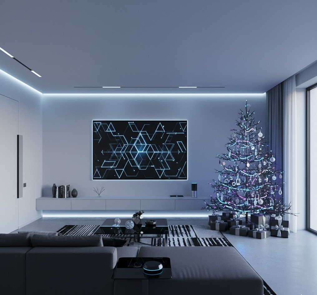 Tech Smart Christmas Decor integrates cutting-edge technology with festive aesthetics, creating an innovative and interactive holiday experience. This modern Christmas decor approach is about convenience, customisation, and a futuristic flair. Materials are often sleek and contemporary, including polished plastics, brushed metals, and LED components, all designed to house smart features seamlessly. The colour palette can be dynamic, with app-controlled RGB lighting allowing for endless customisation, or it can be subtle, focusing on cool whites and blues for a high-tech feel. Decorations include smart lights, digital displays, voice-activated elements, and even projection mapping, transforming spaces with dynamic visual effects. Functionality is paramount, offering effortless control and personalised ambiance at the touch of a button. The mood is innovative, exciting, and effortlessly modern, providing a truly interactive and forward-thinking holiday celebration.