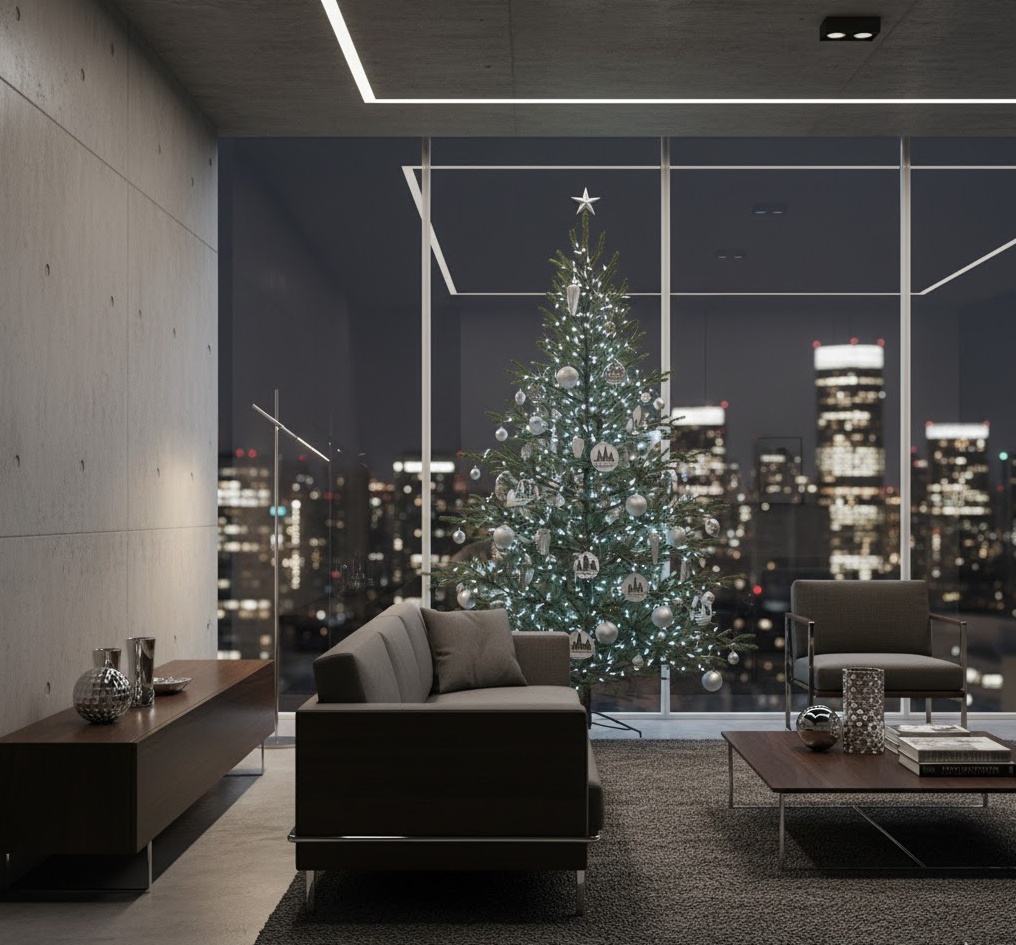 Urban Modern Christmas Elegance captures the sophisticated spirit of city living, blending sleek design with a refined festive touch. This style is characterised by clean lines, a muted colour palette, and a focus on high-quality, contemporary materials. Materials often include concrete, glass, polished metal, dark wood, and luxurious textiles like cashmere or silk, creating a chic and understated backdrop. The colour palette is typically cool and sophisticated, featuring charcoal greys, deep blues, crisp whites, and subtle metallics like chrome or matte black. Decorations are minimalist yet impactful, often featuring abstract shapes, city skyline motifs, or sleek, unadorned baubles. Functionality is about creating a stylish and uncluttered space that feels effortlessly modern. The mood is cool, composed, and highly sophisticated, offering a contemporary and elegant interpretation of holiday cheer that perfectly suits a metropolitan lifestyle.