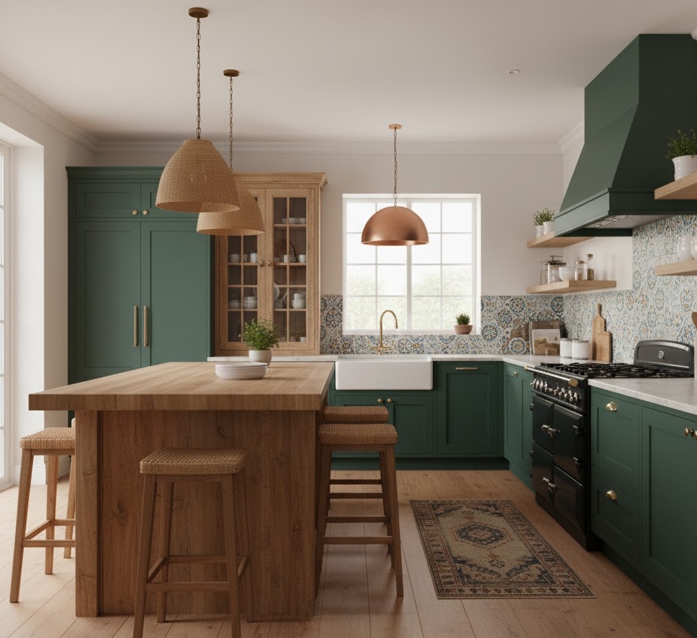 A heritage modern farmhouse kitchen draws inspiration from historical country homes, reinterpreting classic elements with a contemporary sensibility. This style often features bespoke, furniture-style cabinetry, perhaps with beaded or inset panels, and a grand, traditional range cooker as a focal point. Rich, earthy colour palettes, such as deep greens, blues, or warm creams, are common, complemented by natural stone countertops or solid wood. Details like a large pantry cupboard, a plate rack, or a substantial farmhouse table enhance the sense of history and craftsmanship. The mood is one of enduring elegance and timeless comfort, celebrating tradition while offering modern functionality.