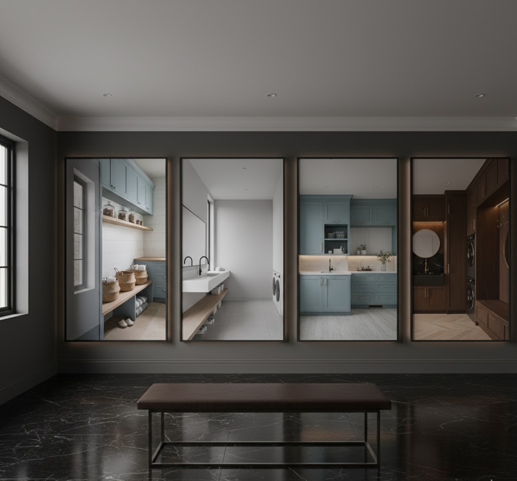 A contemporary mudroom laundry design focuses on current trends, clean lines, and innovative materials, resulting in a sleek and highly functional aesthetic. Expect a refined look with flat-panel cabinetry, often in a sophisticated mix of textures like matte finishes and high-gloss accents, creating visual depth. The colour palette is typically neutral, with sophisticated greys, whites, and blacks, often punctuated by a single bold colour or metallic accent for a modern touch. The mood is fresh and forward-thinking, embodying modern living with an emphasis on efficiency and style. Functionality is highly integrated, with smart storage solutions, energy-efficient appliances, and ergonomic layouts, making this mudroom laundry combo both stylish and incredibly efficient for the modern home.