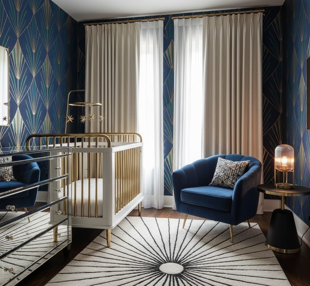 Introduce sophisticated glamour and a touch of vintage opulence with Art Deco nursery furniture, featuring striking geometric patterns and luxurious materials. This distinctive style embraces bold lines, elegant metallic accents like polished brass or gleaming gold, and a rich palette of jewel-toned colours alongside classic black and white. Think streamlined cots with intricate inlays, mirrored dressers that reflect light beautifully, and plush velvet upholstery on seating. Art Deco baby room furniture creates a chic and undeniably elegant space, offering a unique and stylish alternative to more traditional designs. These nursery furniture ideas exude timeless luxury and refined taste.