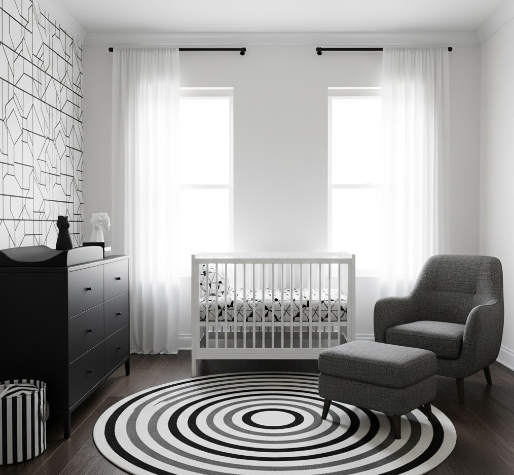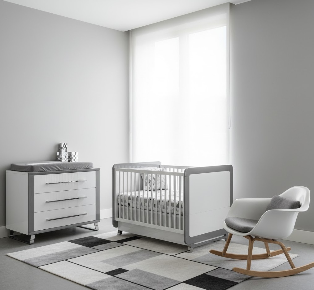 Achieve a striking and sophisticated look with monochrome nursery furniture, utilising a timeless palette of crisp black, pure white, and various elegant shades of grey. This bold style offers high contrast and a classic aesthetic, which is known to stimulate visual development in infants, making it both stylish and beneficial. Furniture often features clean lines and captivating geometric patterns, with varied textures adding depth and interest to the minimalist scheme. Think sleek white cots with black accents, sophisticated grey changing tables, and graphic rugs that tie the room together. These nursery furniture ideas create a chic, modern, and visually engaging baby room that is both stimulating and serene.