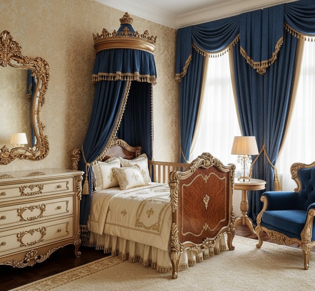 Create a truly regal retreat with royal themed nursery furniture, meticulously designed to make your little one feel like absolute royalty from day one. This opulent style features luxurious fabrics like plush velvet and shimmering silk, exquisite gilded accents, and ornate, intricate details that speak of grandeur. Colours often include rich golds, deep blues, majestic royal purples, and soft, elegant creams, creating a lavish atmosphere. Think grand canopy cots, intricately carved dressers, and plush, upholstered seating fit for a prince or princess. These nursery furniture ideas transform the baby room into a majestic and elegant sanctuary, brimming with sophistication.