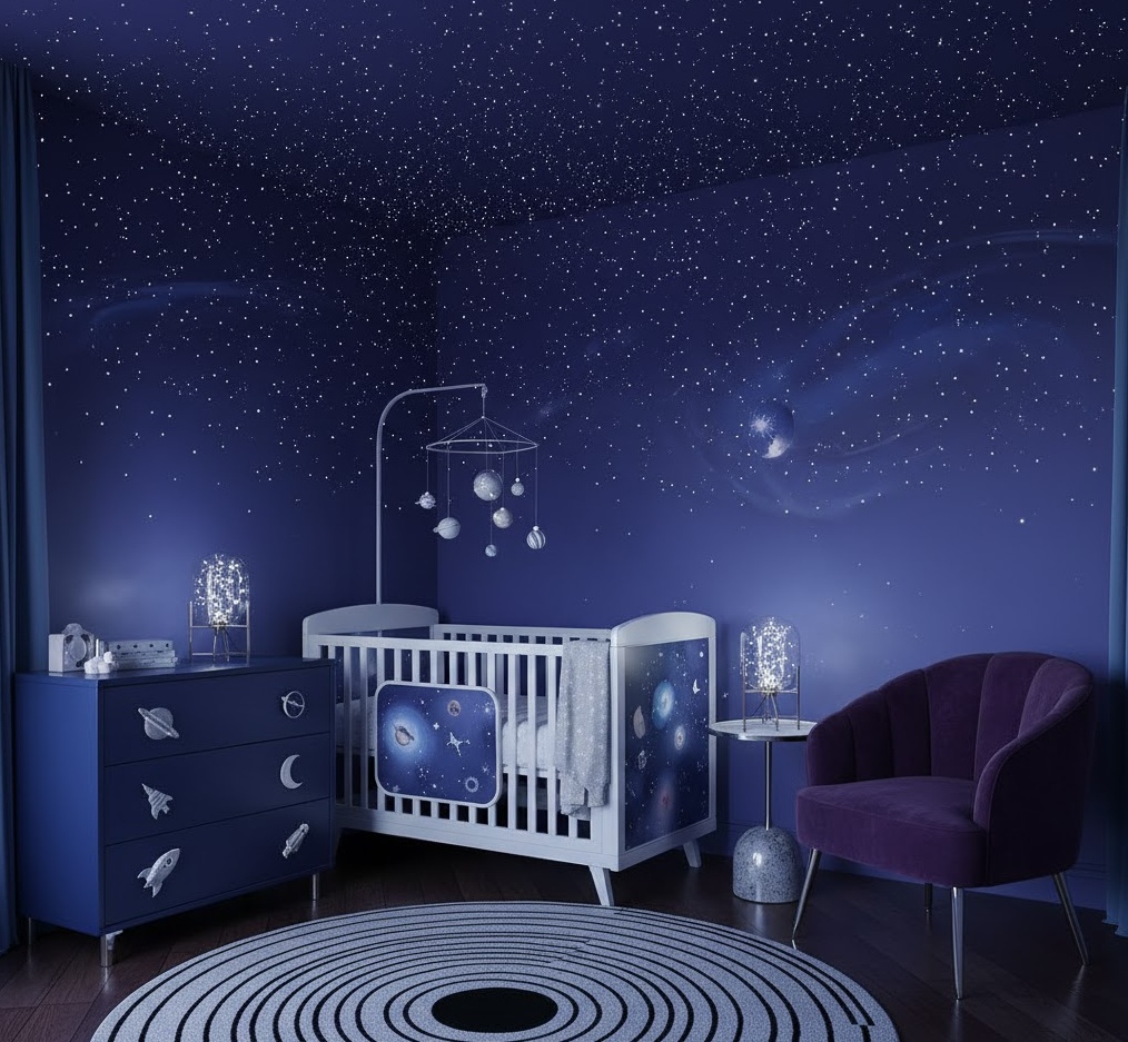 Launch into an extraordinary adventure with space themed nursery furniture, inspiring dreams of distant galaxies and starry nights right in your baby’s room. This imaginative style incorporates captivating celestial motifs, playful rocket ship designs, and a palette of deep blues, mysterious purples, and shimmering silver. Furniture can feature exciting glow-in-the-dark elements, mesmerising star projections, and sleek, futuristic shapes that spark curiosity. Think cots with cosmic patterns, planet-shaped shelves, and moon-inspired lighting fixtures. These nursery furniture ideas create an exciting, educational, and truly immersive environment for your budding astronaut, encouraging exploration and wonder.