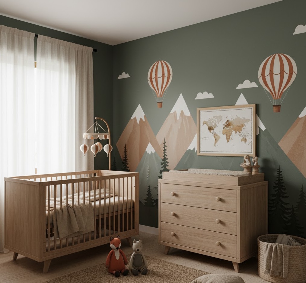 Inspire a spirit of exploration with an Adventure Theme girl nursery, designed for a little one destined for great journeys. This exciting theme uses earthy tones like sage green, terracotta, and warm beige, often accented with pops of mustard or rust. Key elements include hot air balloon motifs, mountain murals, world maps, and charming animal illustrations. Materials such as natural wood, rugged yet soft textiles, and woven baskets contribute to an adventurous yet cosy mood. Functionality is ensured with practical storage for toys and books, creating a stimulating and imaginative space for discovery and dreams.