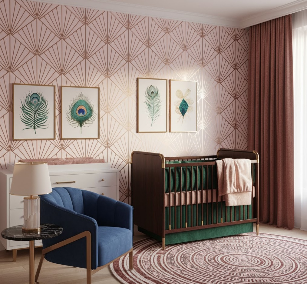 Infuse glamour and sophistication with an Art Deco girl nursery, drawing inspiration from the opulent 1920s era. This distinctive style features rich jewel tones like emerald green, sapphire blue, or deep rose, often paired with metallic gold or brass accents. Geometric patterns are prominent, appearing on wallpaper, rugs, or decorative elements, adding a sense of luxurious symmetry. Furniture is sleek and often lacquered, complemented by sumptuous materials like velvet or satin for bedding and curtains. The mood is elegant and refined, offering a unique and stylish space that is both functional and visually stunning.