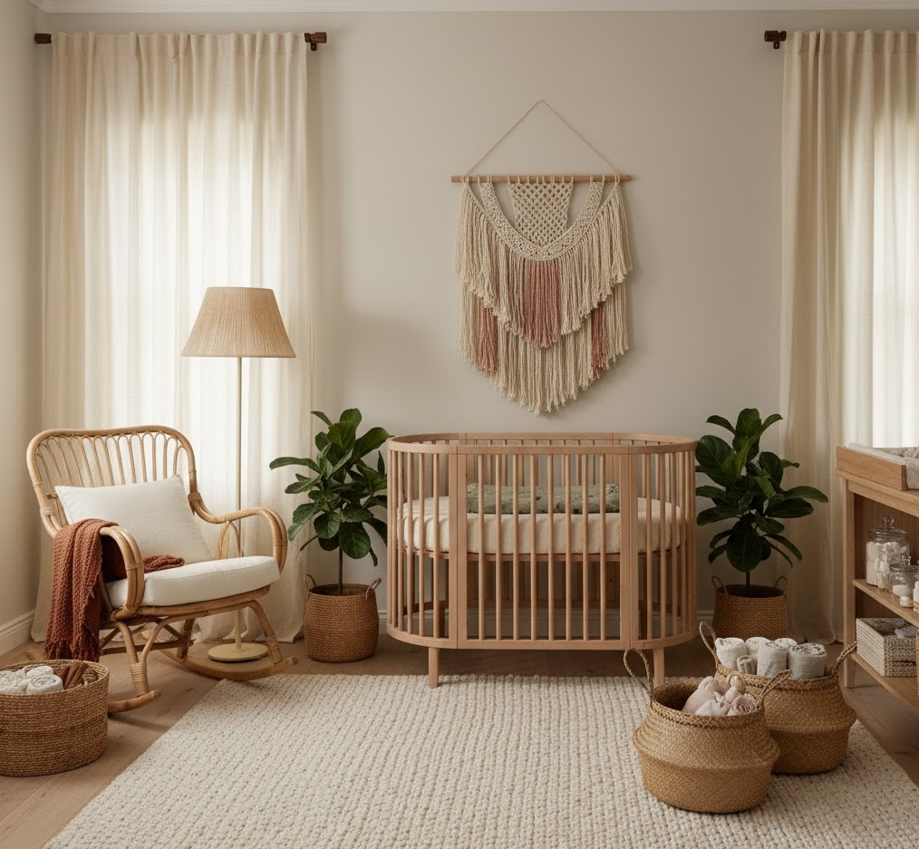 Embrace a free-spirited and earthy vibe with a Boho Chic girl nursery, celebrating natural textures and a relaxed aesthetic. This style champions materials like rattan, macrame, and raw wood, creating a warm and inviting atmosphere for your little one. Colours typically lean towards muted tones such as terracotta, sage green, cream, and soft blush, fostering a calming and organic environment. Functionality is subtly integrated with woven baskets for storage and plush, natural fibre rugs for comfortable playtime, ensuring the space is both stylish and practical. The overall mood is serene and artistic, perfect for nurturing a sense of wonder and creativity.