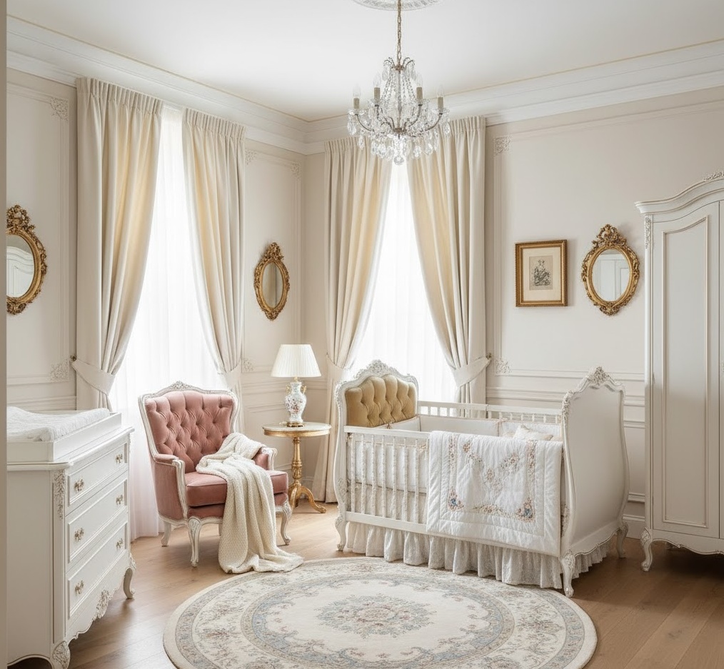 A Classic Elegant girl nursery offers a timeless and sophisticated design, exuding grace and refinement. The colour palette often includes soft creams, muted golds, gentle blues, or sophisticated blush tones, creating a luxurious and calming atmosphere. Furniture is typically ornate white or dark wood, featuring intricate details and high-quality craftsmanship, such as a tufted cot or a grand armoire. Luxurious materials like silk, velvet, and fine cotton are used for bedding and drapery, adding to the opulent feel. This style prioritises enduring beauty and comfort, ensuring a truly regal and functional space for your baby girl.