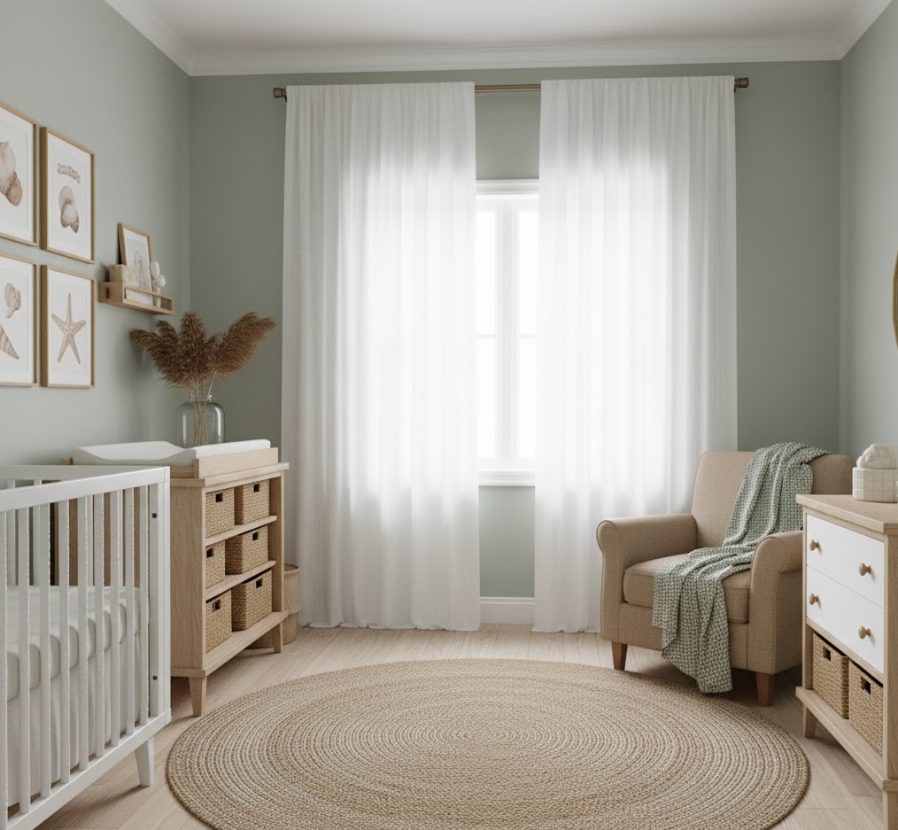 Bring the calming essence of the seaside indoors with a Coastal Theme girl nursery, creating a light and airy sanctuary. The colour palette draws inspiration from the ocean, featuring serene seafoam greens, sandy beiges, crisp whites, and soft blues. Materials like light-washed wood, natural jute rugs, linen curtains, and wicker accents enhance the beachy feel. Decor often includes subtle shell motifs, driftwood elements, or nautical-inspired details, fostering a tranquil and refreshing mood. This design prioritises an open, breathable space, ensuring functionality with practical, durable furnishings that evoke a relaxed holiday vibe.