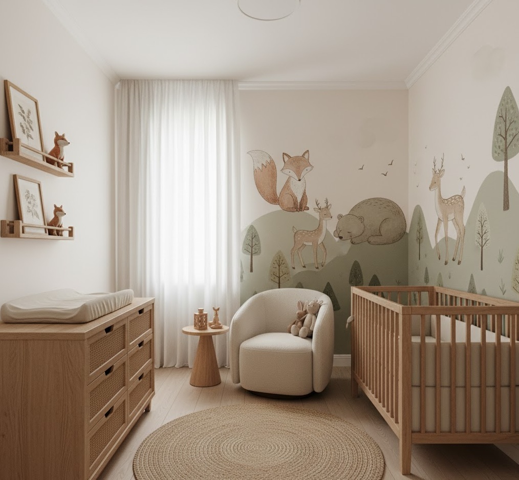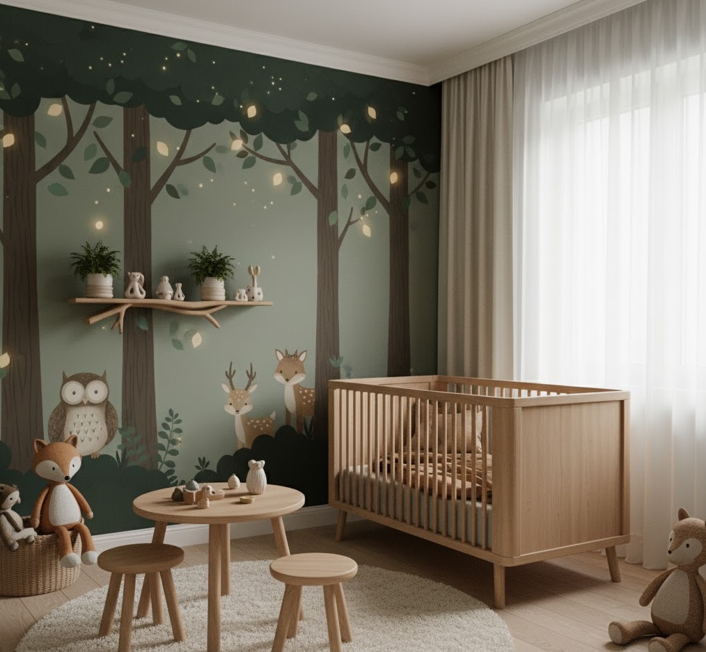 Create a magical haven with an Enchanted Forest girl nursery, transforming the room into a whimsical woodland retreat. This theme embraces earthy greens, warm browns, and soft creams, often accented with touches of blush or gold. Key elements include whimsical tree murals, woodland creature motifs like deer and foxes, and natural wood furniture. Materials such as organic cotton, faux fur rugs, and textured wallpapers enhance the immersive, natural feel, fostering a sense of wonder and adventure. The mood is dreamy and imaginative, providing a calming yet stimulating environment for your little one to explore.