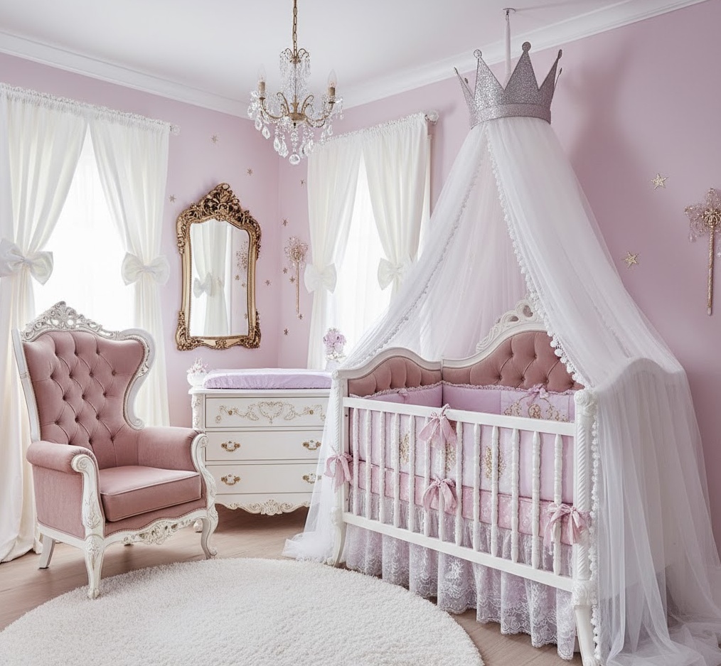 Create a truly magical realm with a Fairytale Princess girl nursery, designed to inspire dreams and wonder. This enchanting theme features a dreamy palette of soft pinks, lavenders, and whites, often accented with shimmering gold or silver. A canopy crib is a central feature, evoking a royal bed, complemented by ornate white furniture and delicate, whimsical decor. Luxurious materials like tulle, satin, and velvet are used for bedding and drapery, adding to the opulent and ethereal mood. Functionality is woven into the magical design with charming storage solutions, ensuring a truly special and practical space for your little princess.