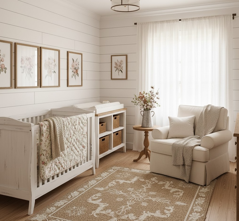 A Farmhouse Chic girl nursery blends rustic charm with modern elegance, creating a warm and inviting atmosphere. This style features a palette of soft whites, creams, and natural wood tones, often accented with gentle floral patterns or subtle pastels. Distressed wooden furniture, shiplap walls, and vintage-inspired decor are key elements, adding character and a homely feel. Materials include cosy knitted textiles, organic cotton, and natural fibres, enhancing the comfortable and relaxed mood. Functionality is paramount, with sturdy, practical pieces and ample storage, ensuring a beautiful yet highly usable space for your baby girl.