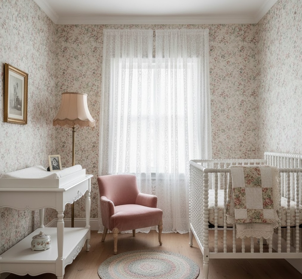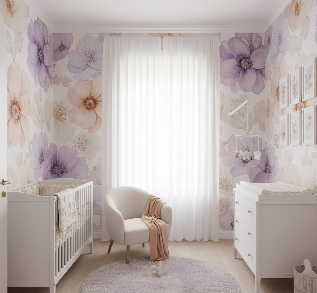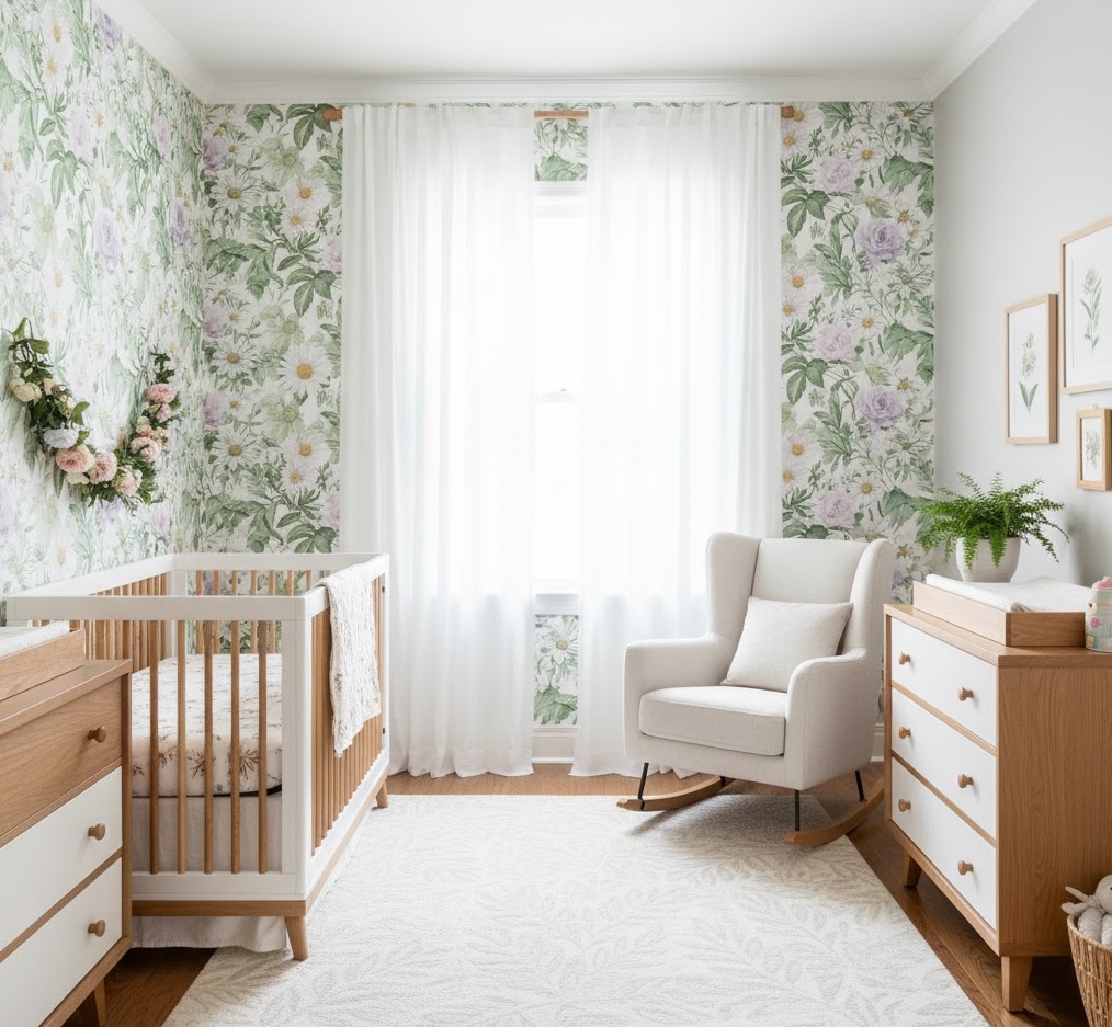 A Whimsical Floral girl nursery blooms with delicate beauty and romantic charm, creating an enchanting garden-like atmosphere. This style often features large-scale floral wallpaper or murals, bringing vibrant botanical elements to life. The colour scheme typically includes soft pastels such as lavender, peach, cream, and gentle pinks, fostering a dreamy and inviting mood. Furniture is often delicate white or light wood, complemented by plush, romantic textiles like ruffled bedding or sheer curtains. Functionality is maintained with ample storage for baby essentials, all while maintaining an ethereal and imaginative aesthetic perfect for a little girl.
