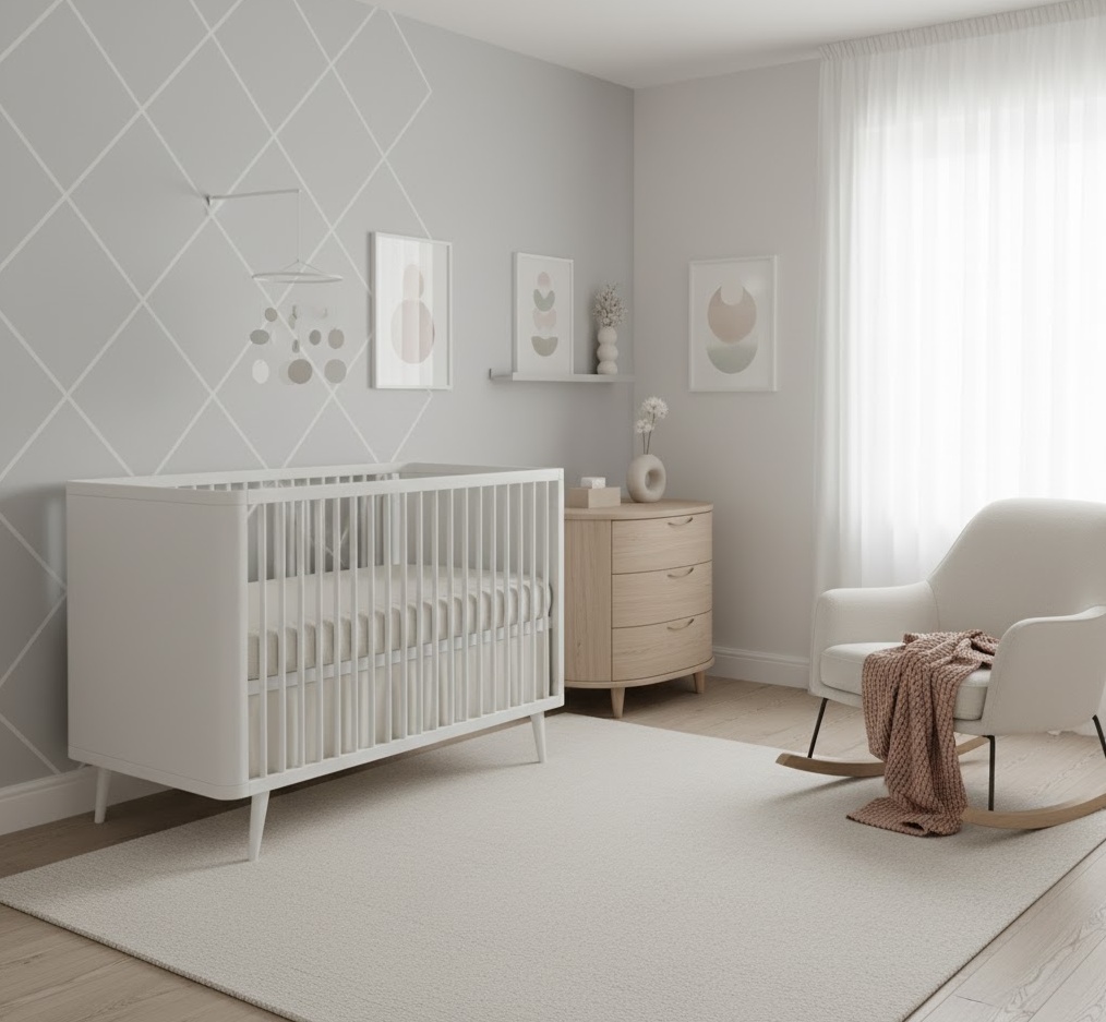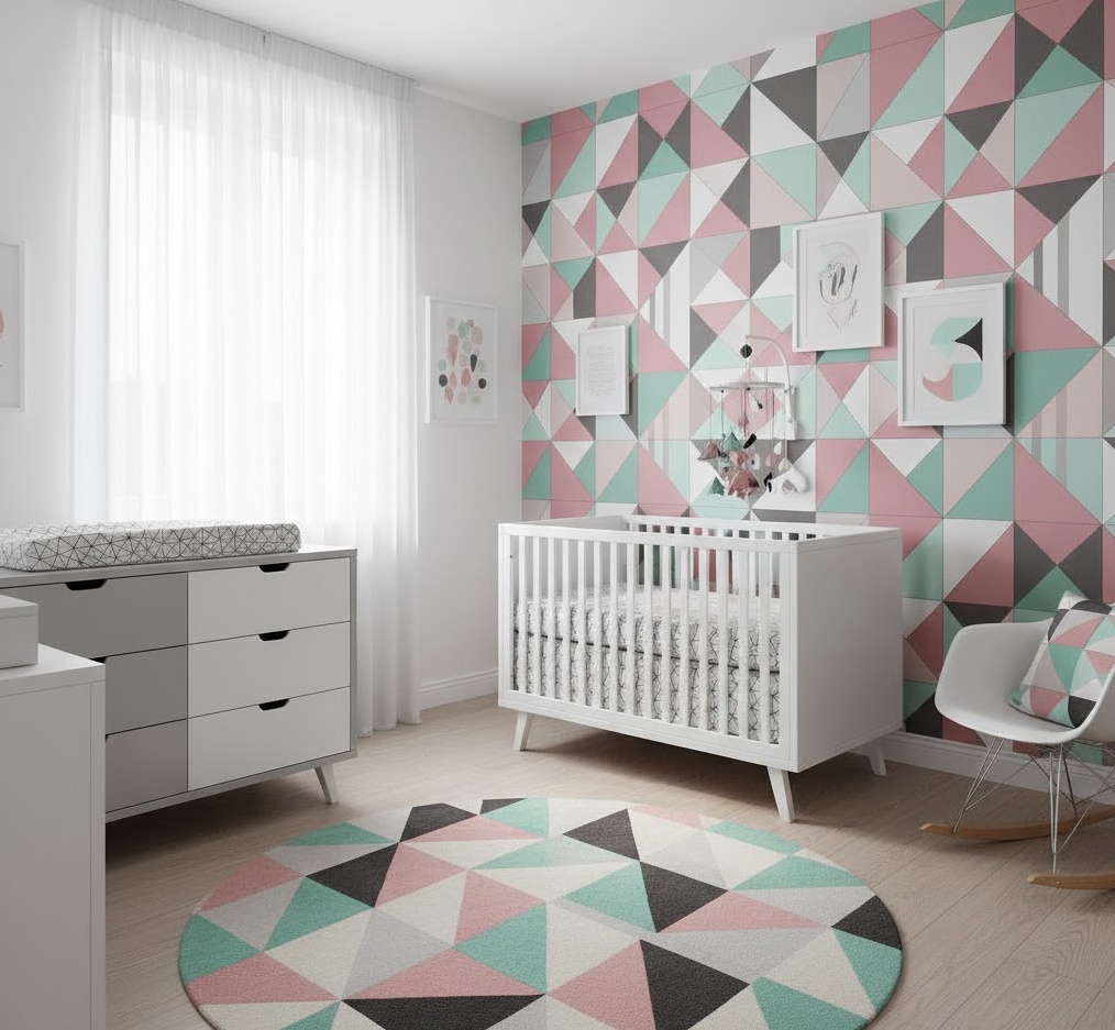 A Geometric Pattern girl nursery offers a modern and playful aesthetic, utilising bold shapes and contrasting colours for a dynamic look. This design often features a vibrant mix of hues like blush pink, mint green, grey, and mustard, creating an energetic yet balanced space. Key elements include geometric wallpaper, patterned rugs, and abstract art prints, adding visual interest and contemporary flair. Furniture is typically clean-lined and minimalist, allowing the patterns to be the focal point. Materials like smooth cotton and felt are used for textiles, ensuring comfort while maintaining a crisp, modern mood that is both stimulating and functional.