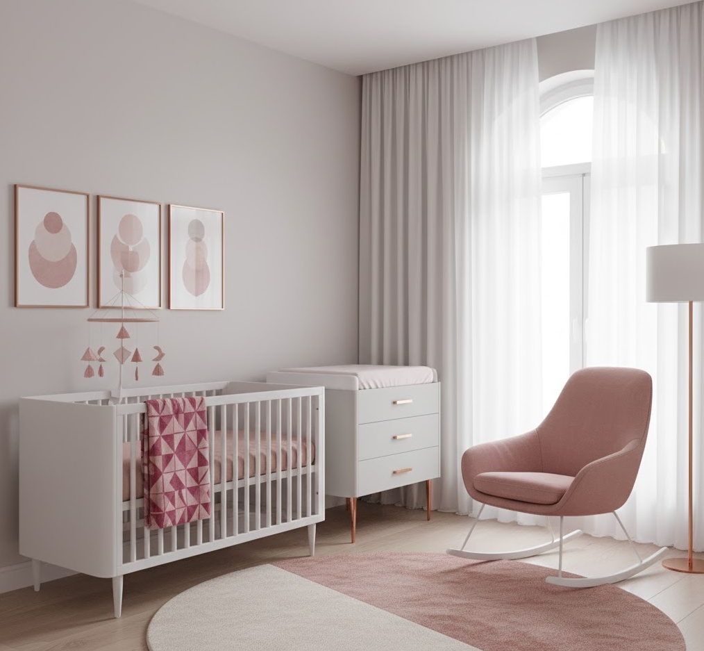 A Modern Pink girl nursery offers a sophisticated and contemporary take on a classic colour, moving beyond traditional saccharine shades. This design utilises varying tones of pink, from soft blush to vibrant fuchsia, often paired with crisp whites, greys, or metallic accents like gold or rose gold. Furniture is sleek and minimalist, featuring clean lines and often high-gloss finishes or light wood. Materials include smooth fabrics, geometric patterns, and contemporary art prints, creating a chic and stylish atmosphere. The mood is fresh and elegant, providing a vibrant yet refined space for your baby girl.