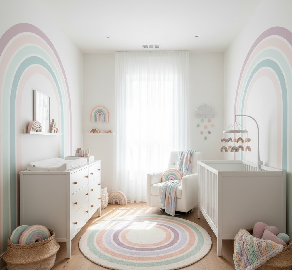 A Pastel Rainbow girl nursery bursts with cheerful charm and gentle vibrancy, creating a playful and uplifting environment. This design embraces a spectrum of soft, muted rainbow colours—blush pink, mint green, lavender, peach, and sky blue—applied in subtle ways. Furniture is typically clean white or light wood, allowing the pastel hues to truly shine through in decor and textiles. Materials include plush rugs, soft cotton bedding, and whimsical rainbow-themed accessories, fostering a joyful and inviting mood. Functionality is met with practical storage solutions that blend seamlessly into the colourful scheme, making it a delightful space for growth.