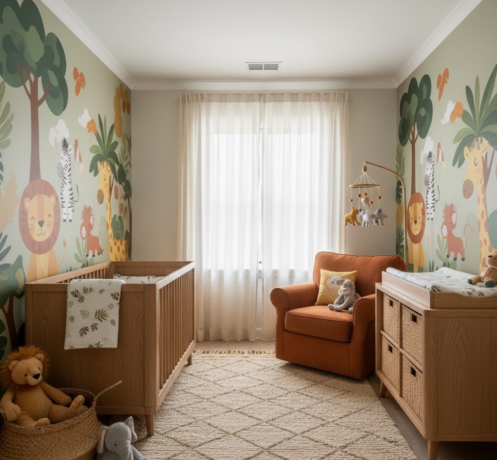 Embark on an exciting adventure with a Playful Safari girl nursery, filled with charming wildlife and vibrant energy. This theme uses a lively mix of earthy greens, sandy beiges, and pops of terracotta, mustard, or blush pink. Key elements include adorable safari animal prints, jungle leaf motifs, and playful patterns on wallpaper or textiles. Natural wood furniture and woven baskets enhance the adventurous yet cosy feel, providing practical storage solutions. The mood is stimulating and joyful, creating a fun and engaging environment where your little one can explore and dream of wild expeditions.