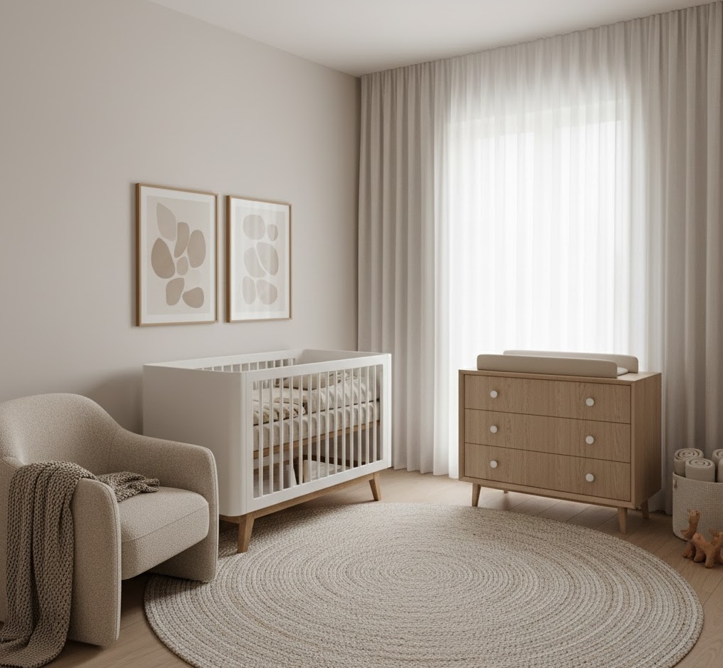 A Soft Neutral girl nursery offers a calming and sophisticated aesthetic, perfect for creating a serene haven. This design focuses on a palette of creams, warm greys, gentle beiges, and subtle off-whites, providing a versatile and timeless backdrop. Materials are key, with an emphasis on luxurious textures like wool, boucle, linen, and cashmere, adding depth and comfort without relying on bold colours. Furniture is typically light wood or painted in soft, muted tones, ensuring a cohesive and tranquil look. The mood is peaceful and inviting, promoting relaxation and offering a highly functional space that can easily adapt as your child grows.