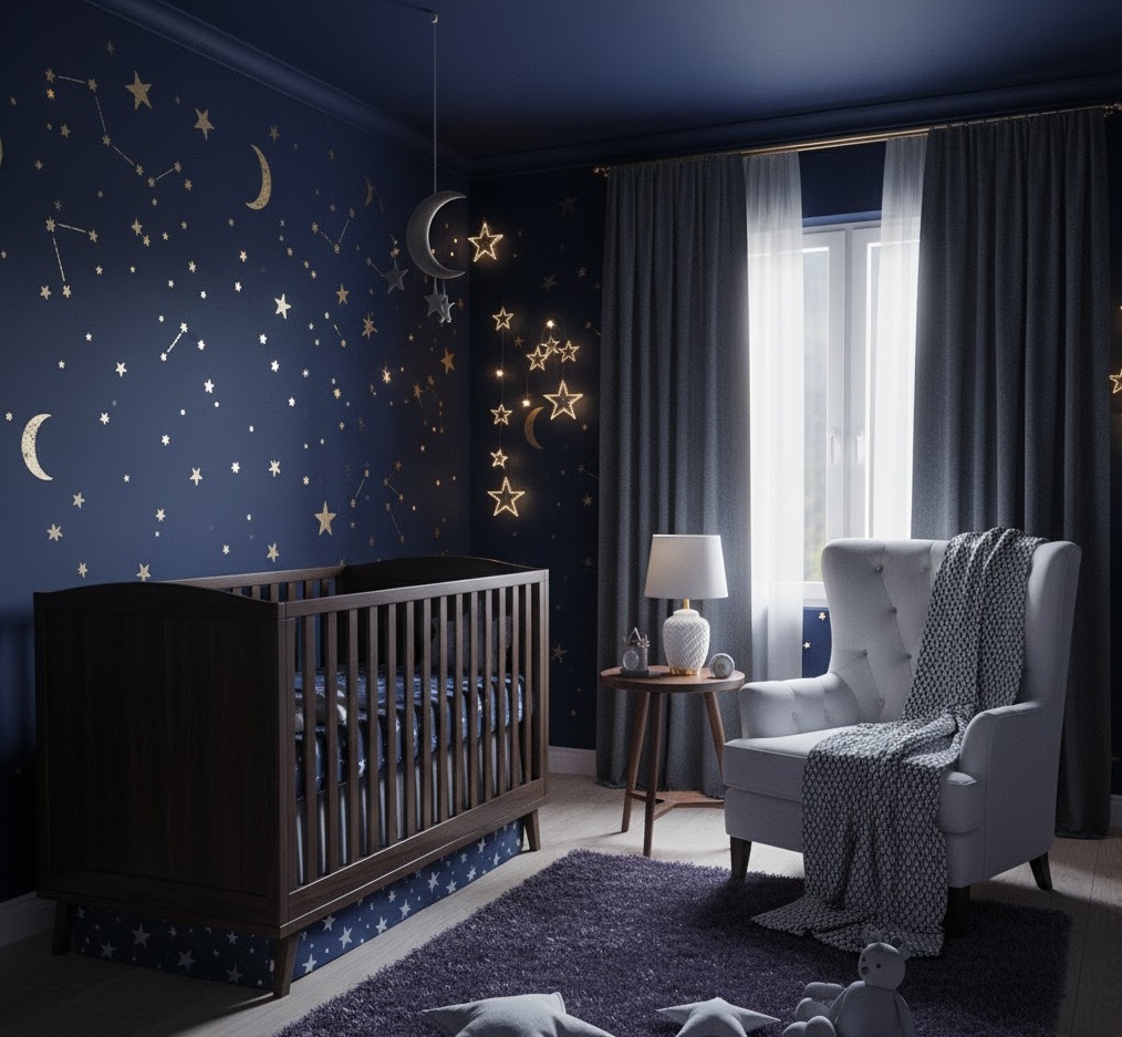 Drift into dreams with a Starry Night girl nursery, creating a celestial and magical sleeping space. This enchanting theme uses deep navy blues, midnight purples, and shimmering silvers or golds to evoke the night sky. Celestial motifs like stars, moons, and constellations are central, often appearing on wallpaper, mobiles, or glow-in-the-dark decals. Furniture can be dark wood for a rich feel or crisp white to contrast the deep colours, complemented by soft, cosy textiles like velvet or faux fur. The mood is dreamy and calming, perfect for lulling your little one to sleep under a canopy of stars.