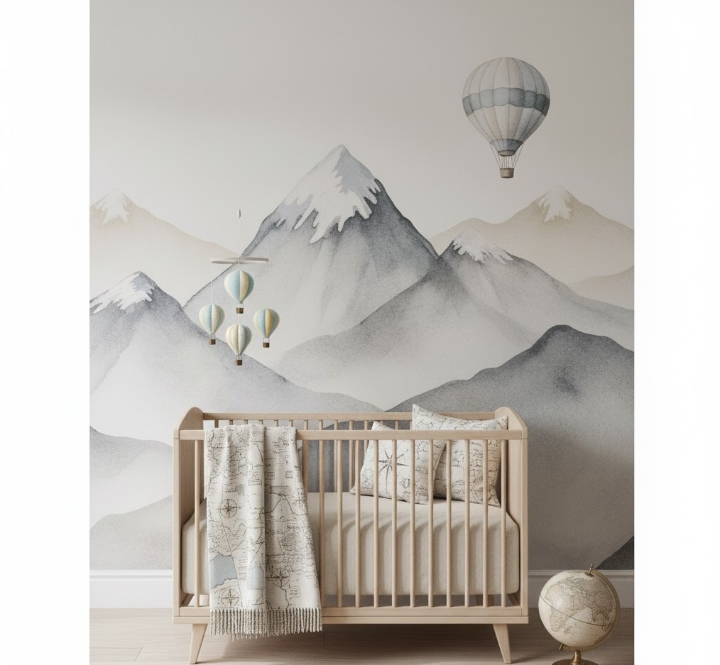 An adventure neutral nursery inspires curiosity and a sense of exploration, creating an exciting yet calming space for your little explorer. This style subtly incorporates travel and nature motifs in muted tones, fostering a spirit of discovery without being overly themed or gender-specific. The colour palette typically features earthy tones like muted greens, warm browns, sandy beiges, and soft greys, reminiscent of landscapes and maps. Materials such as natural wood, canvas, and linen are essential, adding to the rugged yet refined aesthetic. Decor might include subtle mountain murals, hot air balloon mobiles, world map artwork, or animal illustrations. The mood is one of gentle excitement and boundless possibility, providing a stimulating yet serene environment for dreaming of future journeys.