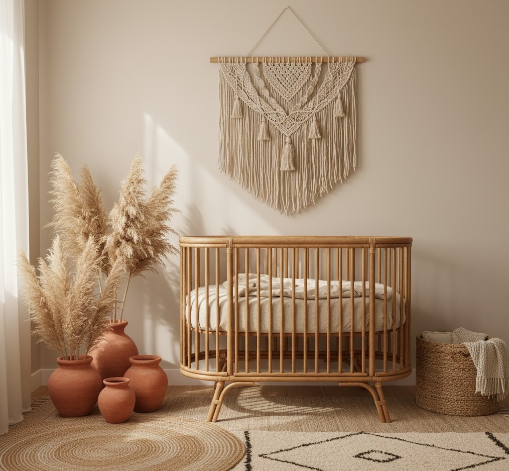 A bohemian neutral nursery exudes a relaxed, free-spirited charm, blending natural textures and earthy tones for a wonderfully inviting space. This style celebrates handcrafted elements and a layered approach, creating a cosy and eclectic atmosphere that feels both unique and comforting. The colour scheme leans into warm beiges, soft creams, terracotta, and muted greens, often accented with natural wood and rattan. Materials like macrame, woven baskets, linen, and jute are essential, adding tactile depth and an organic feel to the room. Furniture often includes a rattan cot, a comfortable floor cushion, and vintage-inspired pieces that tell a story. The mood is one of laid-back warmth and artistic expression, providing a nurturing haven filled with character and gentle stimulation.