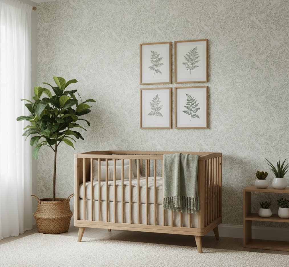 A botanical neutral nursery transforms the room into a fresh and calming oasis, bringing the rejuvenating power of nature indoors. This style focuses on leafy patterns, natural textures, and a soothing green palette, creating a serene and invigorating environment for your baby. The colour scheme typically features various shades of sage green, olive, and mint, beautifully complemented by creamy whites, warm beiges, and natural wood tones. Materials such as linen, cotton, natural wood, and ceramic pots are essential, adding an organic and earthy feel. Decor often includes subtle leaf print wallpaper, faux potted plants (ensuring safety), and botanical illustrations. The mood is one of refreshing tranquillity and natural harmony, providing a peaceful and stimulating space that feels perpetually fresh and connected to the natural world.