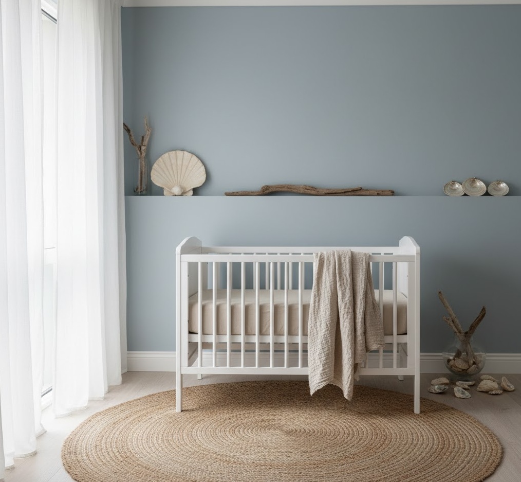 A coastal neutral nursery evokes the serene and refreshing atmosphere of the seaside, creating a light, airy, and calming space for your baby. This style draws inspiration from beach houses and ocean breezes, using a soothing palette and natural textures to achieve a relaxed feel. The colour scheme typically features muted blues, sandy beiges, crisp whites, and soft greys, reminiscent of sea and sand. Materials such as natural linen, woven jute, driftwood accents, and light-coloured woods are key, adding an authentic, organic touch. Furniture is often simple and functional, with a focus on comfort and durability. Decor might include subtle shell motifs, nautical-inspired artwork, or woven wall hangings. The mood is one of tranquil escape and gentle relaxation, providing a peaceful haven that feels perpetually fresh and inviting.