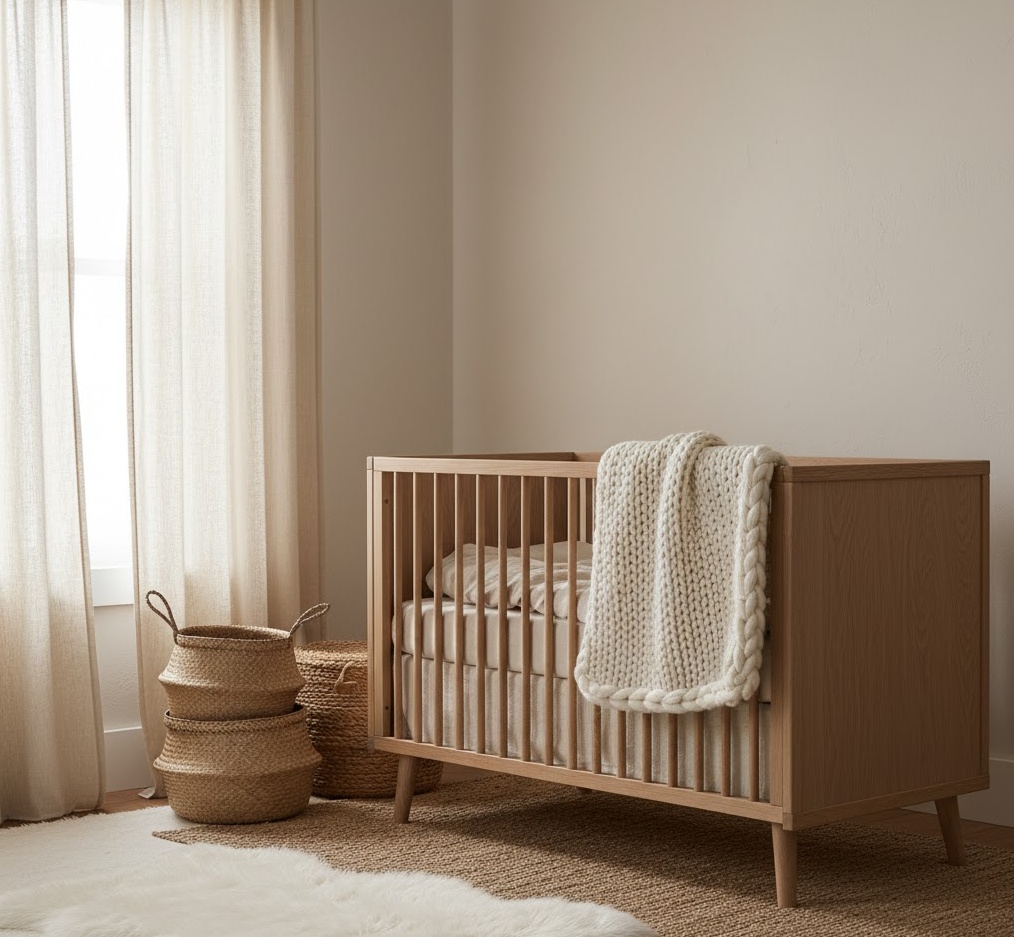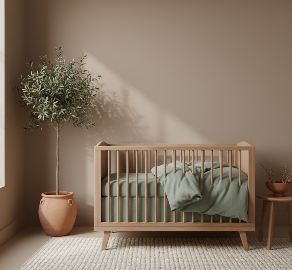 Designing an earthy neutral nursery brings the calming essence of nature indoors, creating a grounded and soothing environment for your baby. This style focuses on a rich palette inspired by the natural world, promoting a sense of peace and connection. Colours include warm terracotta, sage green, deep beige, muted browns, and creamy off-whites, often paired with natural wood finishes. Materials such as organic cotton, linen, wool, and unpolished timber are key, adding texture and authenticity to the space. Furniture is typically simple and robust, allowing the natural colours and textures to take centre stage. The overall mood is one of profound tranquillity and organic warmth, offering a comforting and secure space that feels both timeless and deeply nurturing.