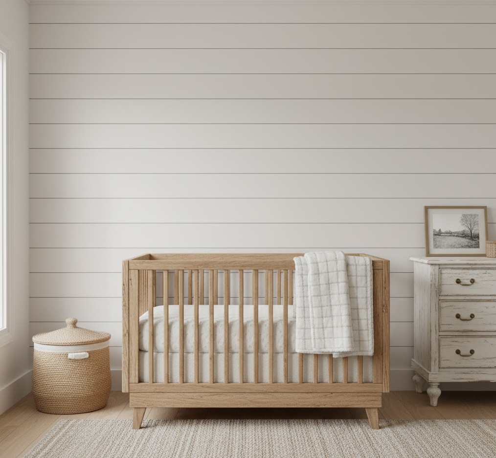A farmhouse neutral nursery combines rustic charm with modern comfort, creating a warm, inviting, and utterly cosy space for your little one. This style celebrates natural materials, distressed finishes, and a homely aesthetic, evoking a sense of timeless simplicity and warmth. The colour palette typically features warm whites, soft greys, muted greens, and natural wood tones, creating a bright yet comforting atmosphere. Materials such as reclaimed wood, shiplap panelling, wrought iron, and natural cotton or linen are essential, adding texture and authenticity. Furniture often includes a sturdy wooden cot, a distressed dresser, and perhaps a comfortable rocking chair with a simple design. The mood is one of comforting nostalgia and gentle warmth, providing a nurturing and secure environment that feels both traditional and fresh.