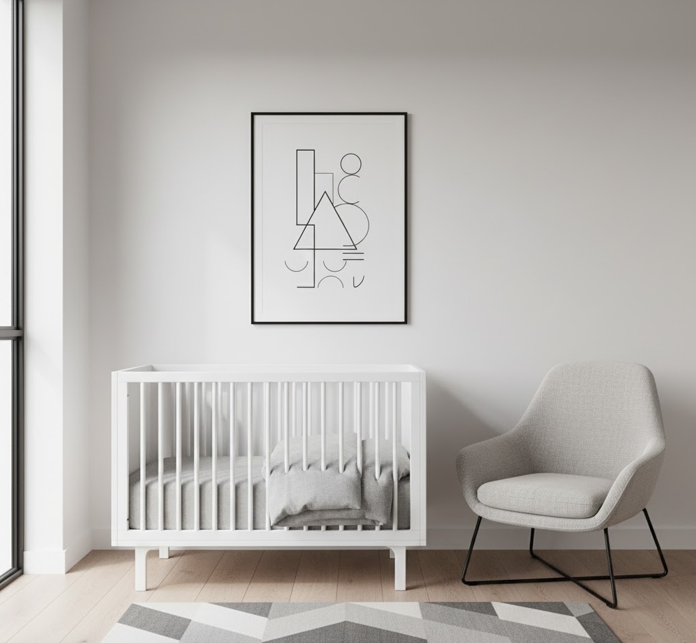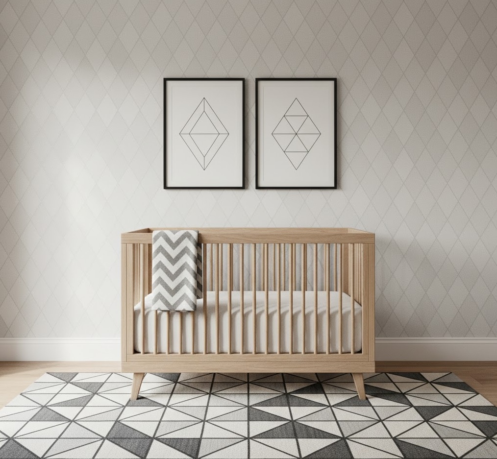 A geometric neutral nursery brings a modern and playful edge to the space, utilising clean lines and abstract shapes within a calming, balanced palette. This style offers visual stimulation and contemporary flair, perfect for a chic and engaging environment. The colour scheme typically features crisp whites, various shades of grey, soft blacks, and subtle, desaturated accent colours like muted mustard or sage. Materials such as smooth wood, durable fabrics, and sleek metal are often used, contributing to a polished and structured look. Decor is key, with geometric patterns appearing on rugs, wallpaper, wall art, and even mobiles, creating dynamic interest. The mood is one of sophisticated playfulness and modern calm, providing a stimulating yet harmonious space that encourages visual development and a sense of order.