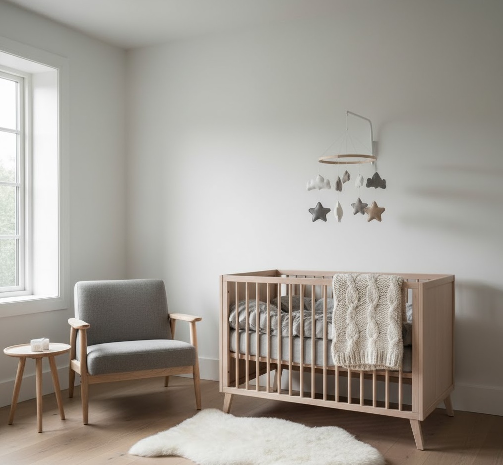 Embrace the ‘hygge’ concept with a Scandinavian neutral nursery, renowned for its warmth, simplicity, and natural elements. This style prioritises light-filled spaces, functional design, and a connection to nature, creating a calming and stimulating environment for your baby. The palette is dominated by crisp whites, muted greys, and soft pastels, beautifully complemented by the extensive use of light-coloured woods like birch or ash. Materials such as sheepskin rugs, knitted blankets, and linen curtains add layers of texture and cosiness, inviting comfort and play. Furniture is typically sleek and practical, often featuring rounded edges for safety and a timeless aesthetic. The overall mood is one of serene comfort and understated elegance, fostering a peaceful yet engaging space for growth and discovery.