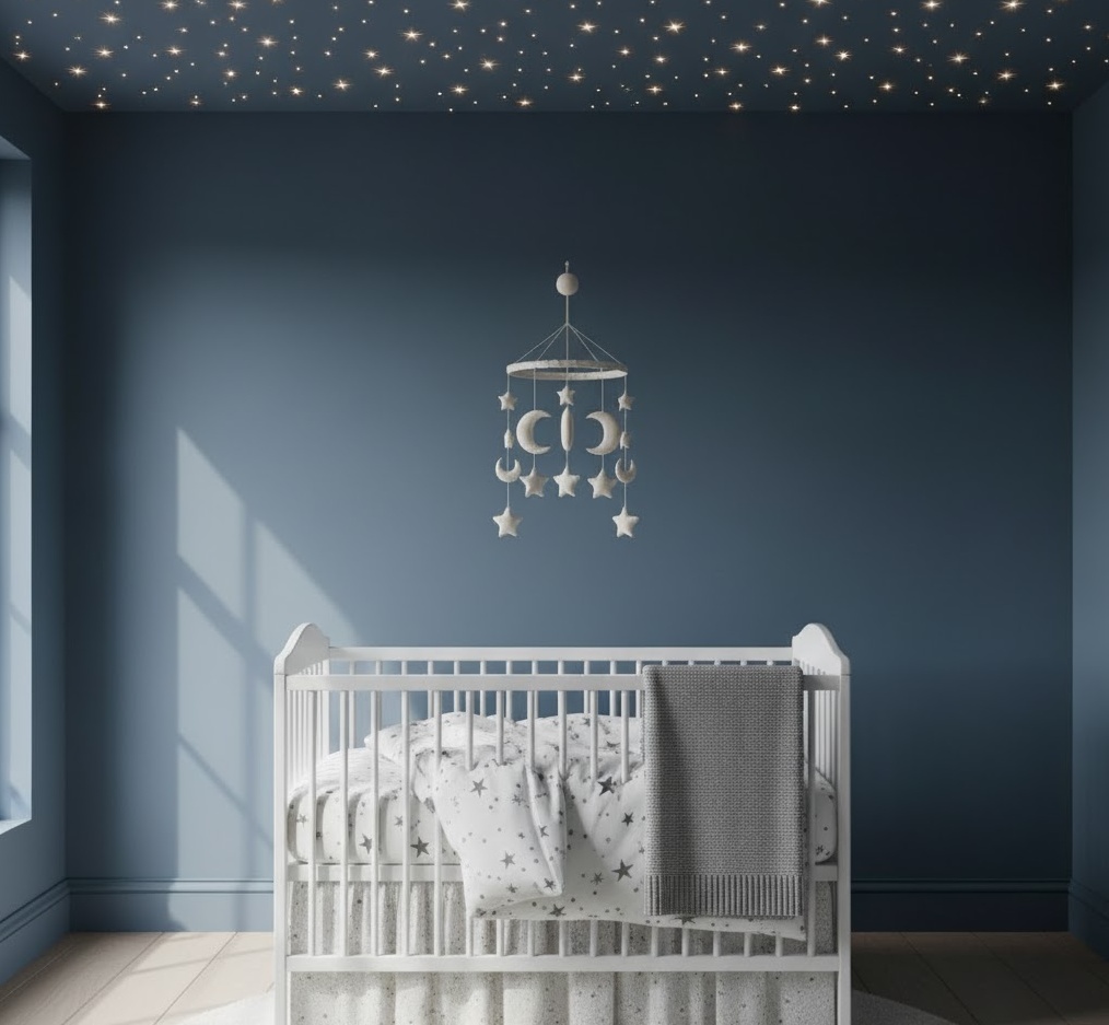 A starry night neutral nursery creates a magical and serene celestial haven, perfect for peaceful sleep and dreamy contemplation. This style captures the wonder of the night sky using a sophisticated, muted palette and subtle star motifs, fostering a sense of calm and awe. The colour scheme typically features deep, muted blues, soft greys, crisp whites, and subtle silver accents, evoking the tranquil beauty of a starlit evening. Materials such as soft velvet, plush cotton, and delicate sheer fabrics are used to create an ethereal and comforting atmosphere. Decor might include glow-in-the-dark star decals, a moon-shaped mobile, or constellation-inspired artwork. The mood is one of profound tranquillity and gentle wonder, providing a deeply soothing and enchanting space for your baby to drift off to sleep.