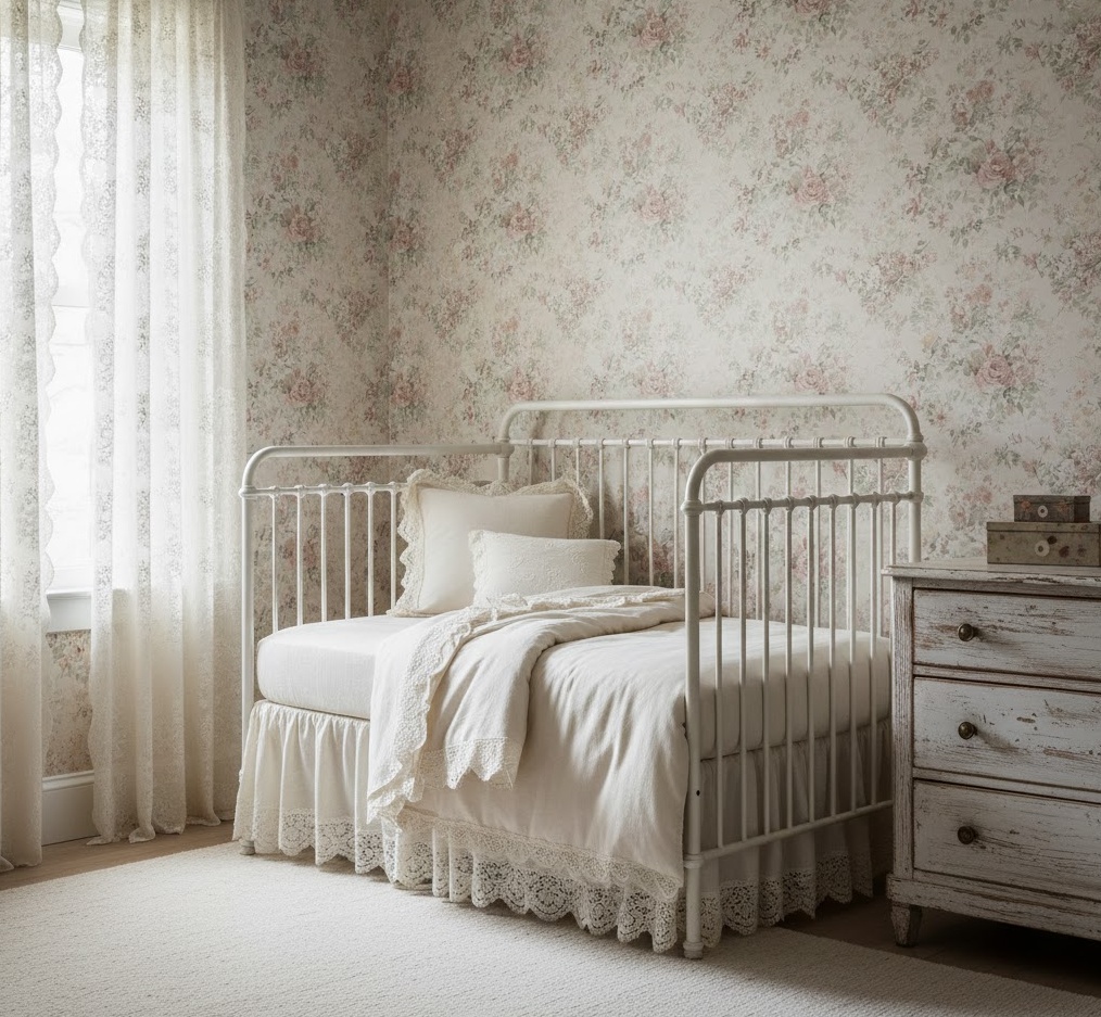 A vintage neutral nursery evokes a sense of nostalgic charm and timeless beauty, creating a wonderfully unique and comforting space for your baby. This style celebrates antique-inspired furniture, distressed finishes, and delicate details, blending old-world elegance with modern sensibility. The colour palette typically features soft creams, muted pastels, warm beiges, and gentle greys, creating a soft and inviting atmosphere. Materials such as distressed wood, wrought iron, delicate lace, and soft cotton are integral, adding texture and a sense of history. Furniture often includes an antique-style iron cot, a distressed wooden dresser, and perhaps a classic rocking chair. The mood is one of gentle nostalgia and enduring warmth, providing a nurturing and secure environment that feels both traditional and deeply personal.
