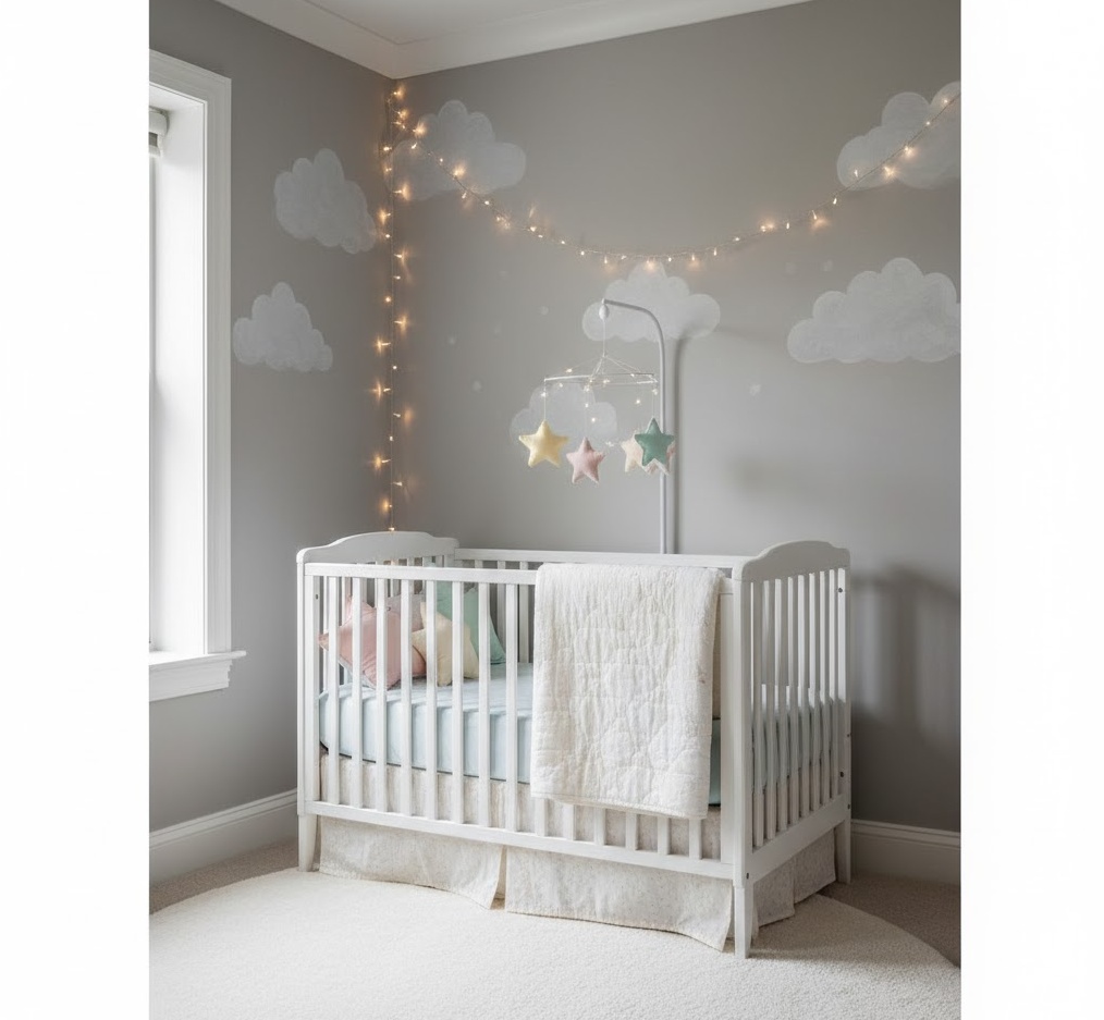 A whimsical neutral nursery sparks imagination and wonder, creating a dreamy and playful space that remains sophisticated and calm. This style subtly incorporates fantastical elements and gentle patterns, fostering a sense of magic without overwhelming the senses with bright colours. The palette typically features soft pastels like mint, peach, lavender, and baby blue, expertly blended with creamy whites and light greys. Materials such as delicate tulle, soft cotton, and light wood are used to create an ethereal and inviting atmosphere. Decor might include subtle cloud motifs, star-patterned mobiles, or charming animal illustrations in muted tones. The mood is one of gentle enchantment and playful serenity, providing a nurturing environment where dreams can flourish and imagination can take flight in a beautifully understated way.