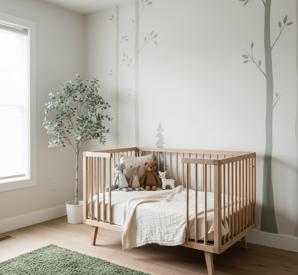 A woodland neutral nursery brings the enchanting magic of the forest indoors, creating a cosy and adventurous space for your baby. This theme subtly incorporates natural motifs and earthy tones, fostering a sense of wonder and connection to the outdoors without being overly childish. The colour scheme typically features muted greens, warm browns, soft greys, and creamy whites, reflecting the natural hues of a forest. Materials like natural wood for furniture, faux fur rugs, knitted textures, and linen textiles are essential, adding warmth and tactile interest. Decor often includes subtle tree decals, forest animal illustrations, and charming woodland creature plush toys. The mood is one of gentle adventure and comforting natural beauty, providing a serene yet stimulating environment for imaginative play and peaceful sleep.