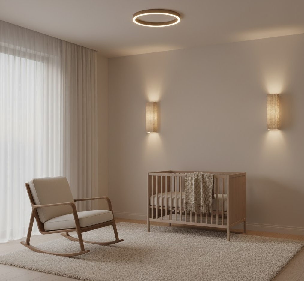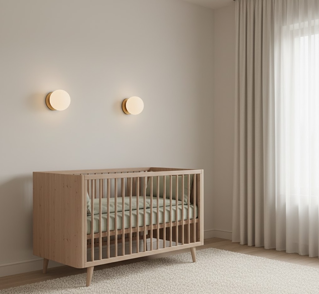 Create a soft, comforting ambience with gentle glow wall lighting, perfect for providing subtle illumination without disturbing a sleeping baby. These thoughtful nursery lighting ideas include sconces, night lights, or LED strips strategically placed to cast a diffused, indirect light. Materials often feature frosted glass, fabric shades, or natural wood, typically in warm whites, creams, or soft pastels to enhance the calming effect. The mood is serene and secure, ideal for late-night checks or comforting a restless baby. Functionally, wall lights free up floor space and offer a consistent, low-level light source that helps maintain a peaceful sleep environment.
