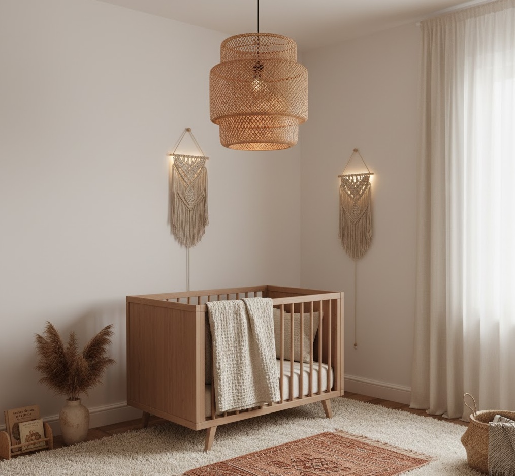 Embrace a relaxed, free-spirited vibe with boho chic nursery lighting, bringing warmth and character to your little one’s space. This style often incorporates natural materials like rattan, bamboo, macramé, or woven textures in pendant lights and floor lamps, casting intricate patterns of light and shadow. Colours typically lean towards earthy tones, creams, and muted pastels, complementing a natural, organic aesthetic. The mood is cosy and inviting, perfect for creating a serene sanctuary. Functionally, these fixtures provide a soft, ambient glow, often layered with fairy lights or string lights for added charm and a gentle night-time illumination.