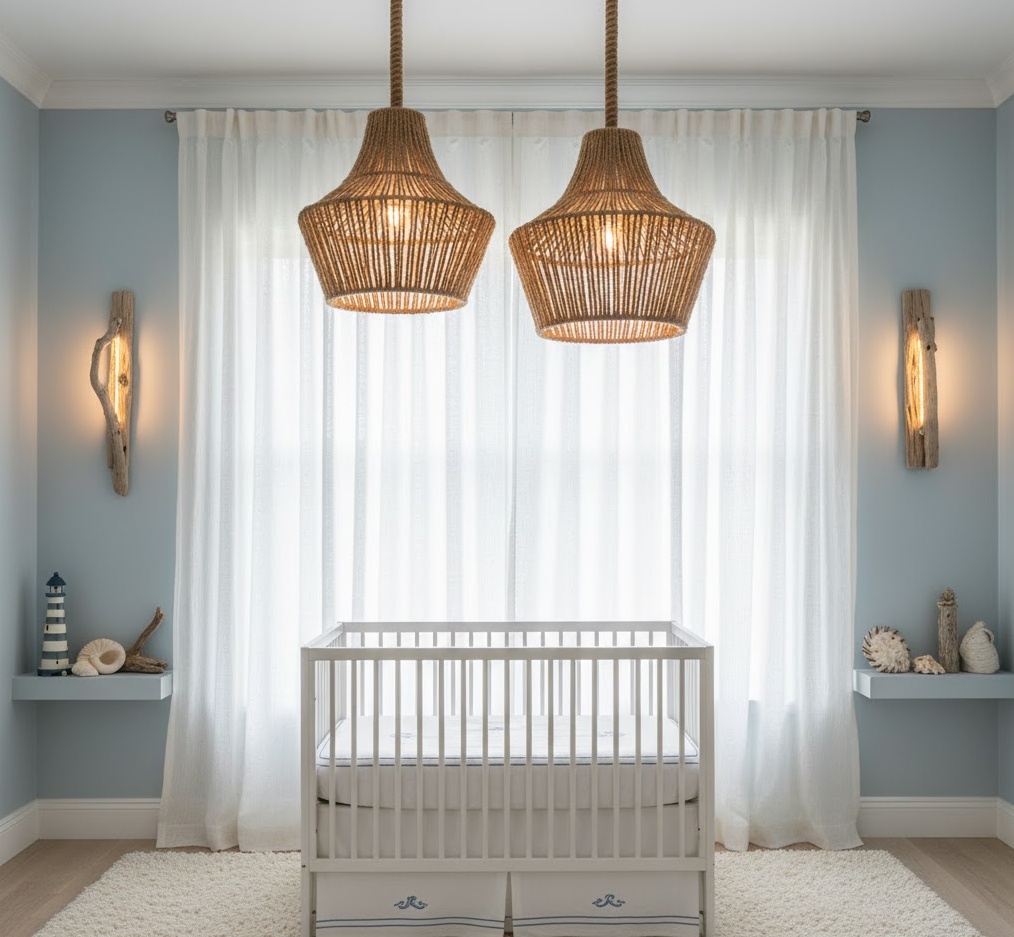 Bring the calming essence of the seaside into the nursery with coastal serenity lighting, fostering a peaceful and airy environment. These refreshing nursery lighting ideas often incorporate elements like rope, driftwood, shell accents, or woven textures, evoking a beach house feel. Colours typically feature serene blues, crisp whites, sandy beiges, and natural wood tones, creating a light and breezy aesthetic. The mood is tranquil and relaxing, perfect for a soothing baby’s room. Functionally, coastal fixtures provide a bright yet gentle illumination that enhances the open, airy feel of the space, making the nursery a calming retreat reminiscent of the ocean.