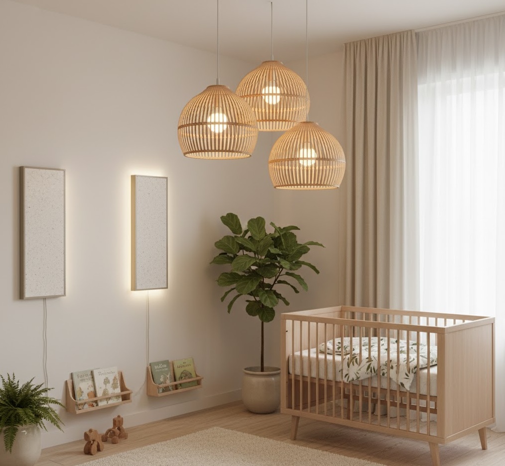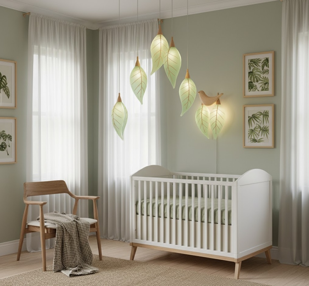 Bring the tranquility of the outdoors inside with nature-inspired nursery lighting, fostering a serene and organic atmosphere. These charming nursery lighting ideas often feature elements like leaves, branches, animals, or floral motifs in their design, crafted from materials such as wood, rattan, or frosted glass. Colours typically reflect natural palettes – greens, browns, soft blues, and earthy tones – creating a harmonious and calming visual. The mood is peaceful and grounding, connecting the baby to the natural world. Functionally, these fixtures provide a gentle, diffused light that complements a natural theme, perfect for a calming and stimulating environment.