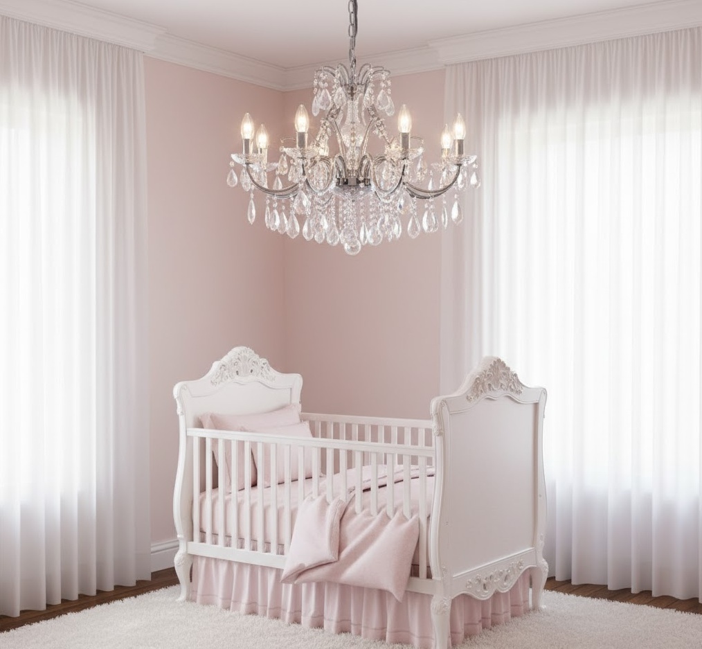 Introduce a touch of sophistication and grandeur with elegant chandelier nursery lighting, elevating the room’s aesthetic. These luxurious nursery lighting ideas feature smaller, more delicate versions of traditional chandeliers, often adorned with crystals, beads, or intricate metalwork. Materials typically include polished chrome, antique brass, or clear glass, with colours ranging from classic whites and silvers to soft pastels. The mood is refined and charming, adding a focal point of understated glamour. Functionally, a chandelier provides beautiful ambient light, often with a dimmer, creating a magical sparkle that makes the nursery feel truly special and opulent.