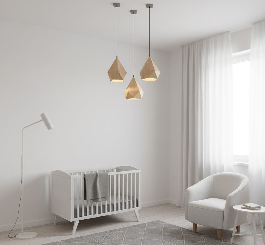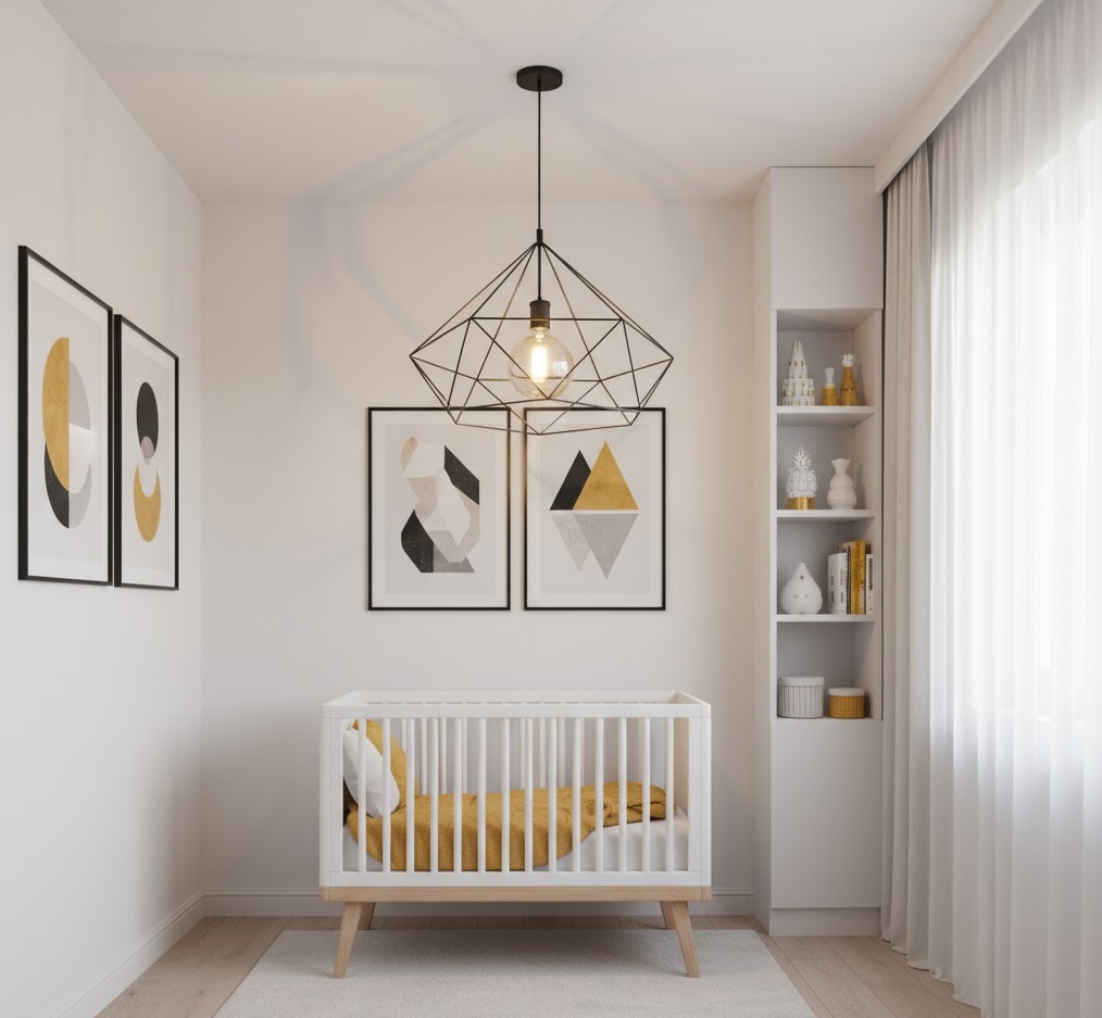 Add a contemporary and stylish edge to the nursery with geometric pattern lighting, introducing visual interest and modern flair. These striking nursery lighting ideas feature fixtures with clean lines, angular shapes, and often open frameworks that cast intriguing patterns of light and shadow. Materials typically include metal, wood, or acrylic, in colours such as black, white, gold, or vibrant accents. The mood is chic and dynamic, perfect for a modern or eclectic nursery design. Functionally, geometric lights serve as both a light source and a sculptural art piece, providing ambient light while enhancing the room’s aesthetic with their distinctive forms.