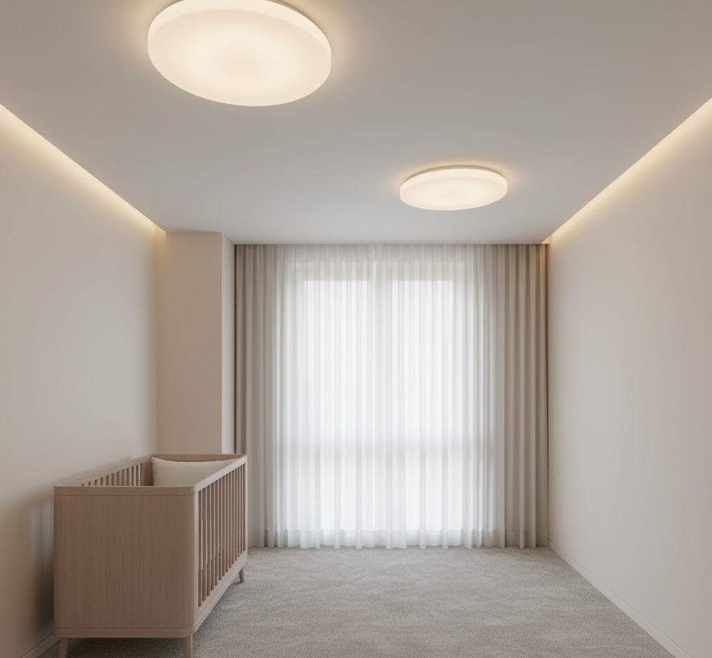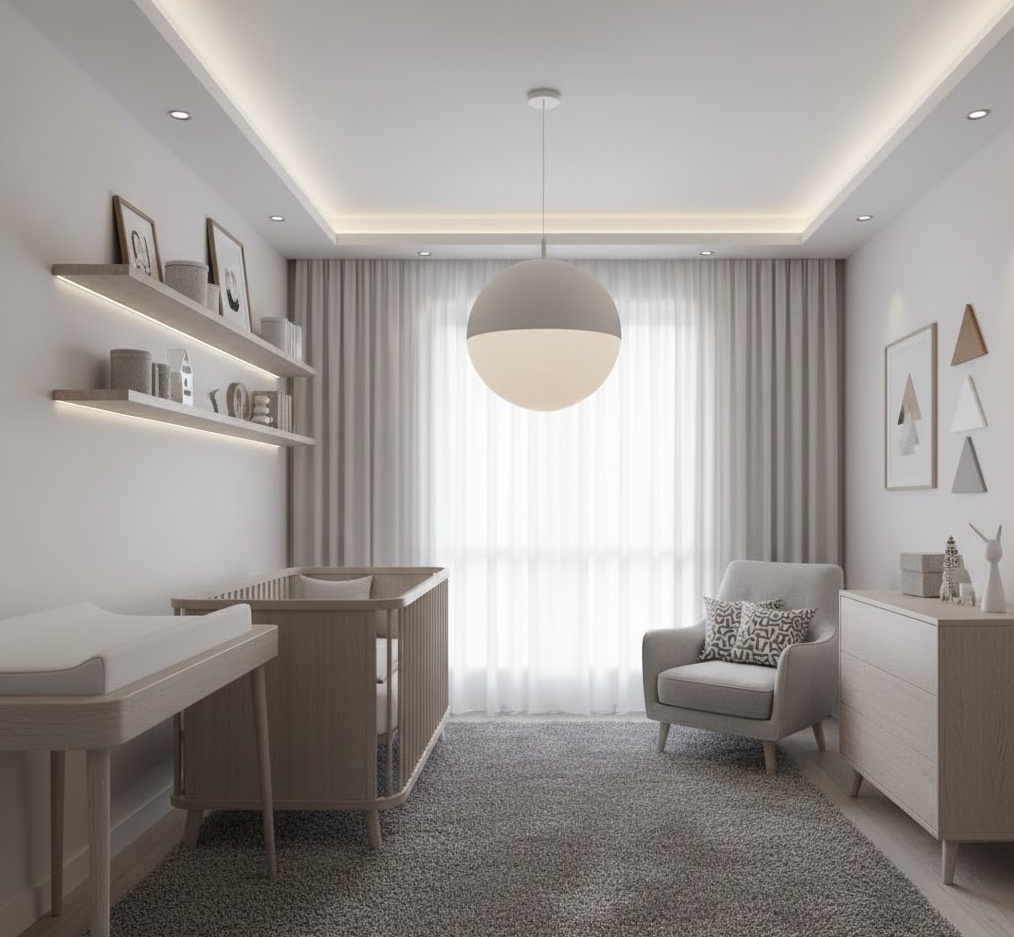 For a sleek and uncluttered nursery, modern minimalist lighting offers clean lines and understated elegance. These nursery lighting ideas focus on simplicity and functionality, often featuring geometric shapes, matte finishes, and integrated LED technology. Materials like brushed metal, frosted glass, or smooth acrylic in neutral colours such as white, black, or grey dominate, ensuring a sophisticated aesthetic. The mood is calm and contemporary, promoting a sense of order and spaciousness. Functionally, minimalist fixtures provide efficient, often dimmable, light that can be directed for task lighting or diffused for ambient illumination, seamlessly blending into the modern nursery design.